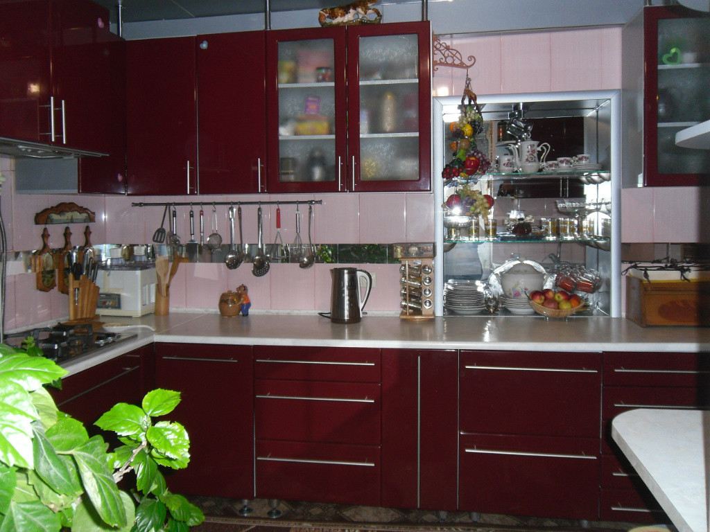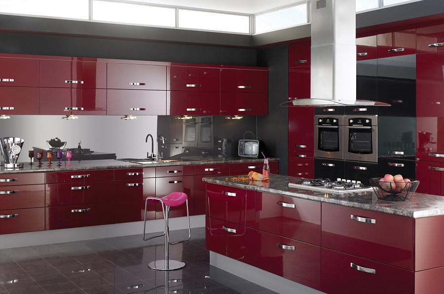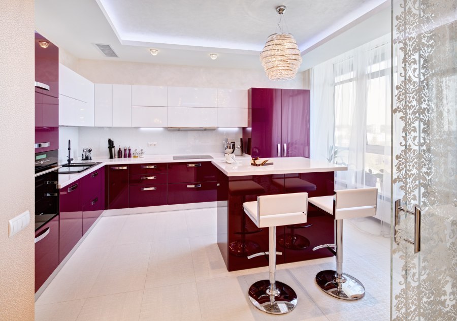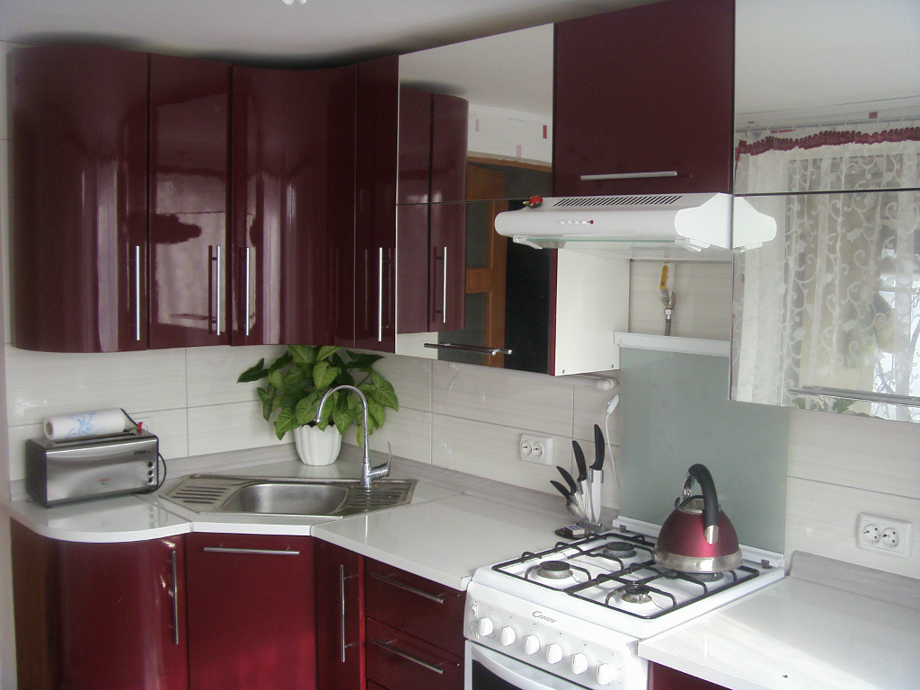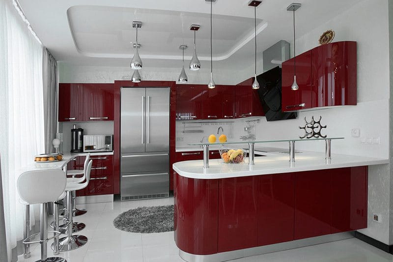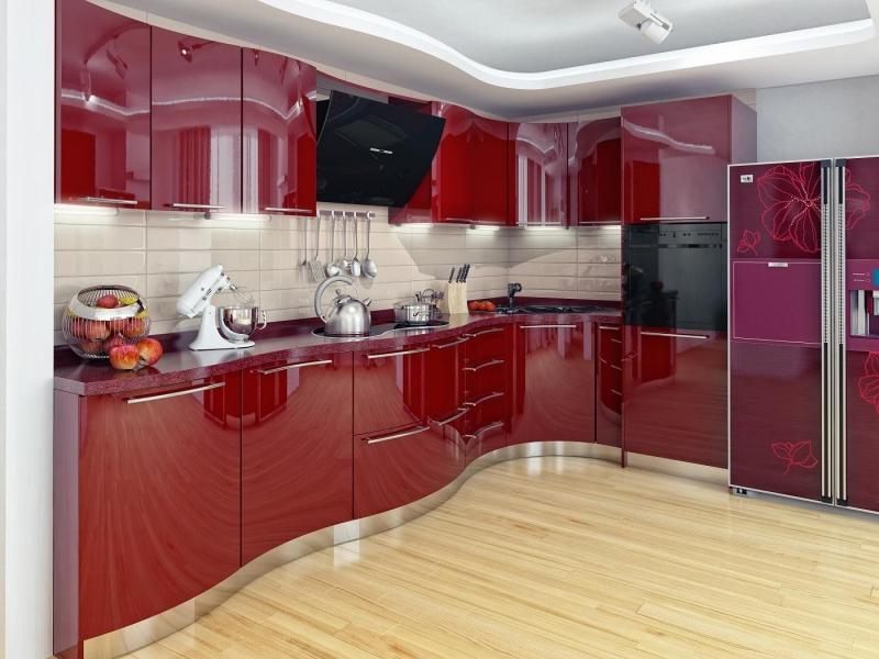 - Acrylic kitchen with a glossy surface will give Art Nouveau, high-tech style a special chic. The combination of luxury burgundy and chrome always looks advantageous and rich.