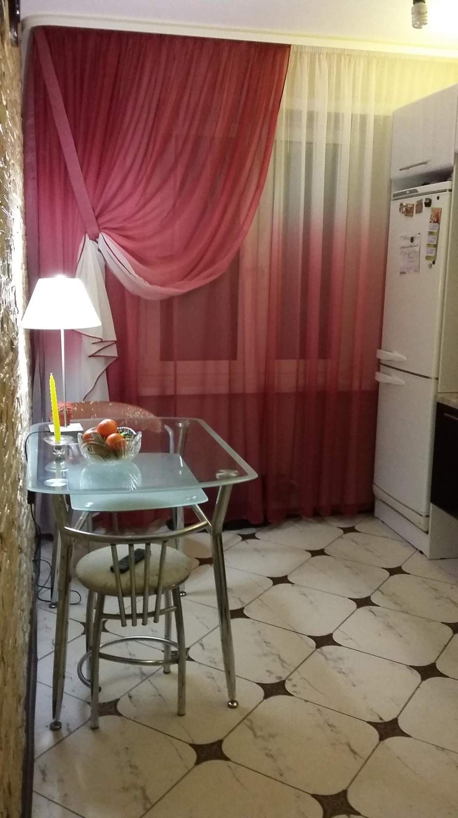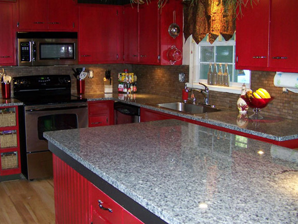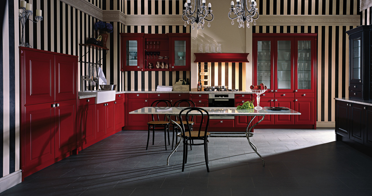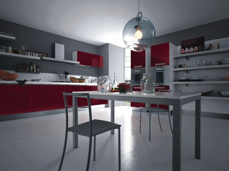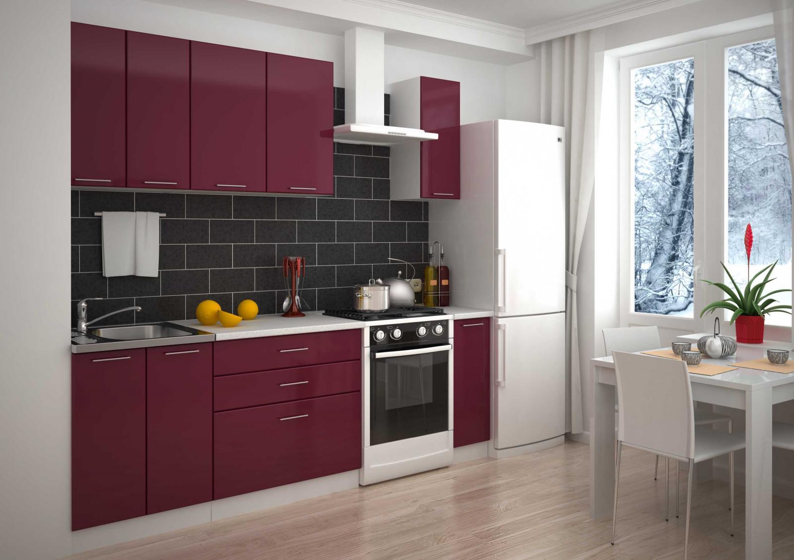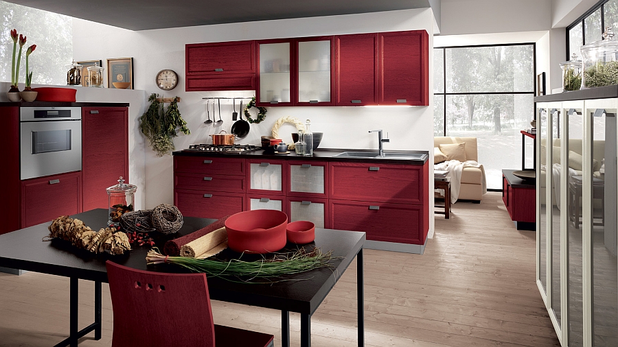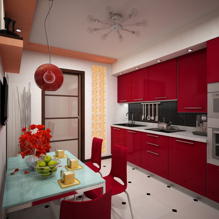 The chic, ripe cherry-colored kitchen looks particularly attractive thanks to the white countertop, silver handles and soft radius elements. Perfect for a large dining room, studio apartment.