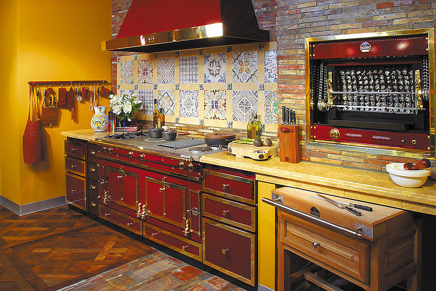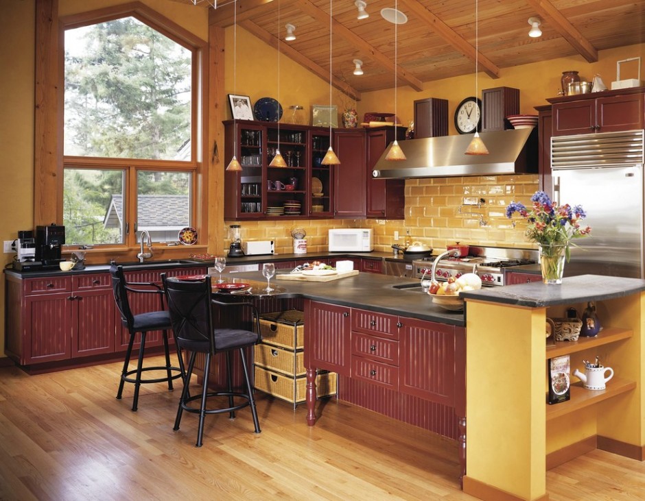 - Since brown is at the heart of the color, a cherry, carmine color kitchen is the perfect choice for a country style. A headset made of natural wood will be appropriate here, and ceramics, mosaics, homespun textiles are perfect as a decor.