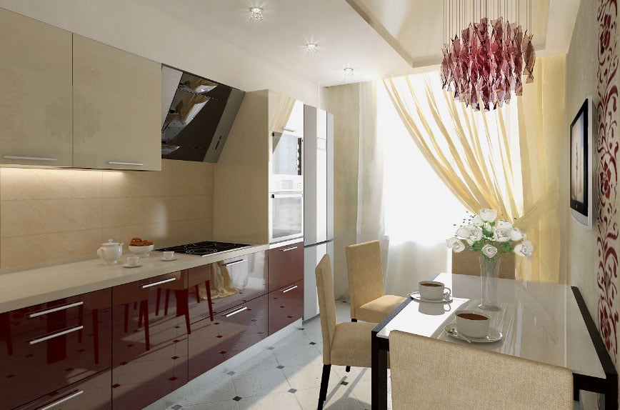 With an abundance of light, a burgundy set with vanilla, sand color looks excellent. The kitchen as a result turns out to be bright, warm and comfortable for all family members.