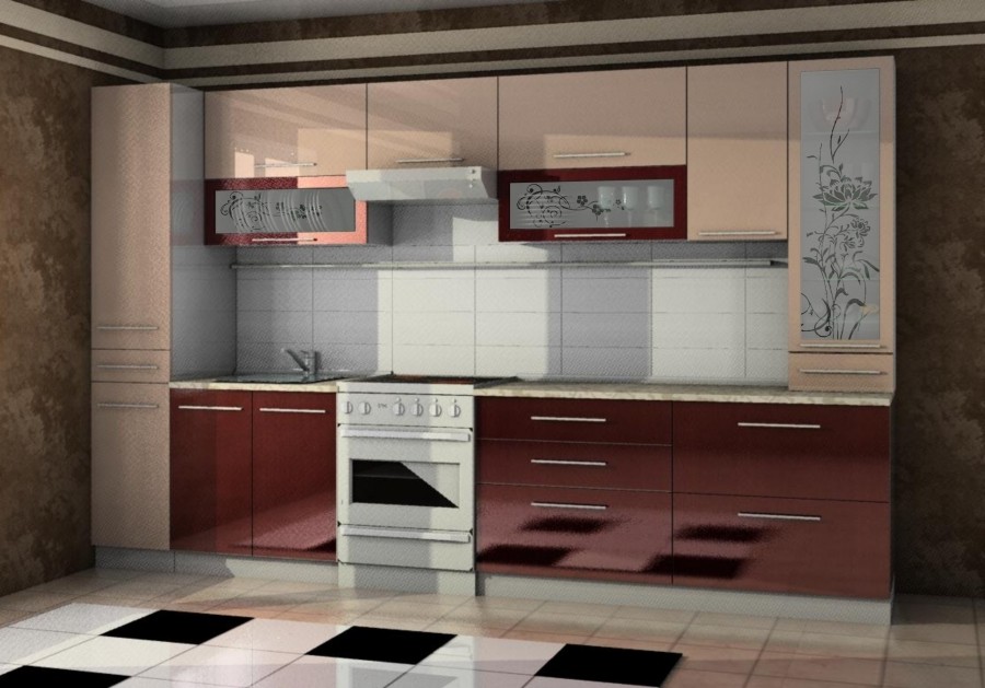 It can be completely burgundy, with facades in this color lower or upper part. Chrome hardware and glass elements look great. The glossy surface visually looks lighter, and due to the reflectivity the room will be brighter. The matte facade is no less attractive, but suitable only for a spacious room. Walls under such a set are best designed in milk, caramel, gray, pale pink.