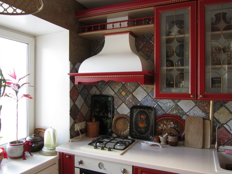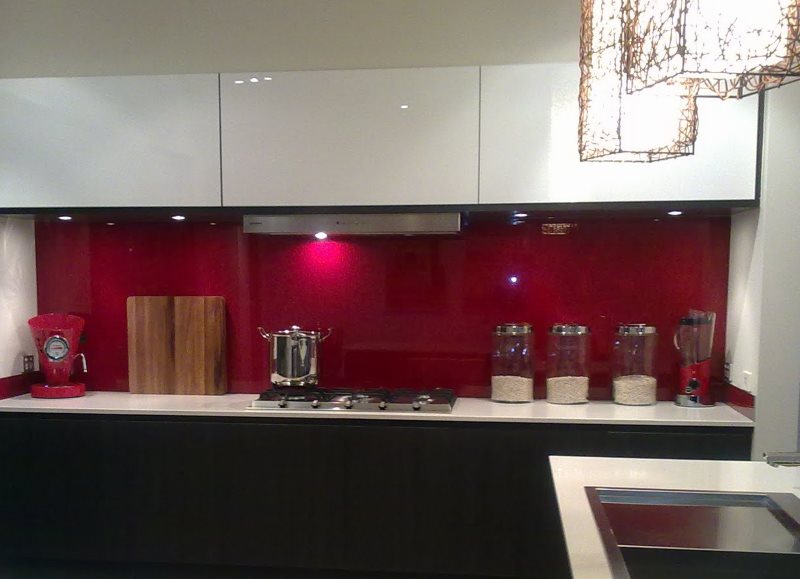 Functional decoration of a modern kitchen will become an interior decoration. The apron is made of ceramic tiles, glass, natural stones. The originality will amaze the mosaic, for example, made in contrasting black and burgundy colors.