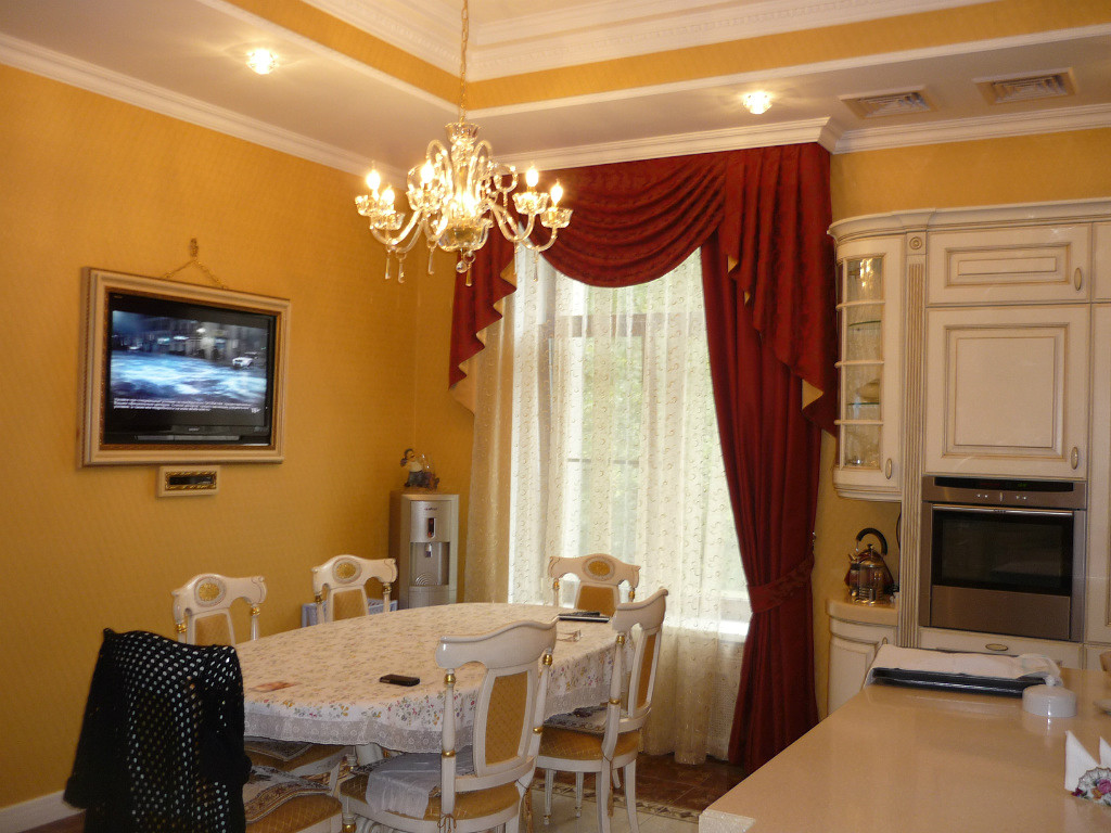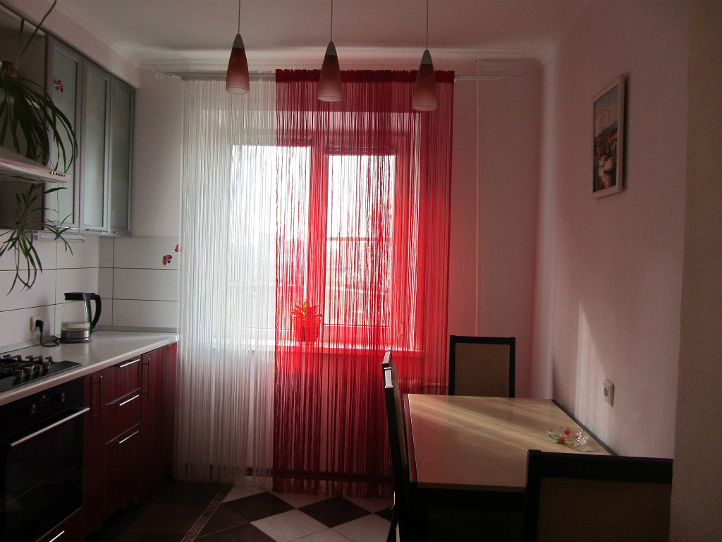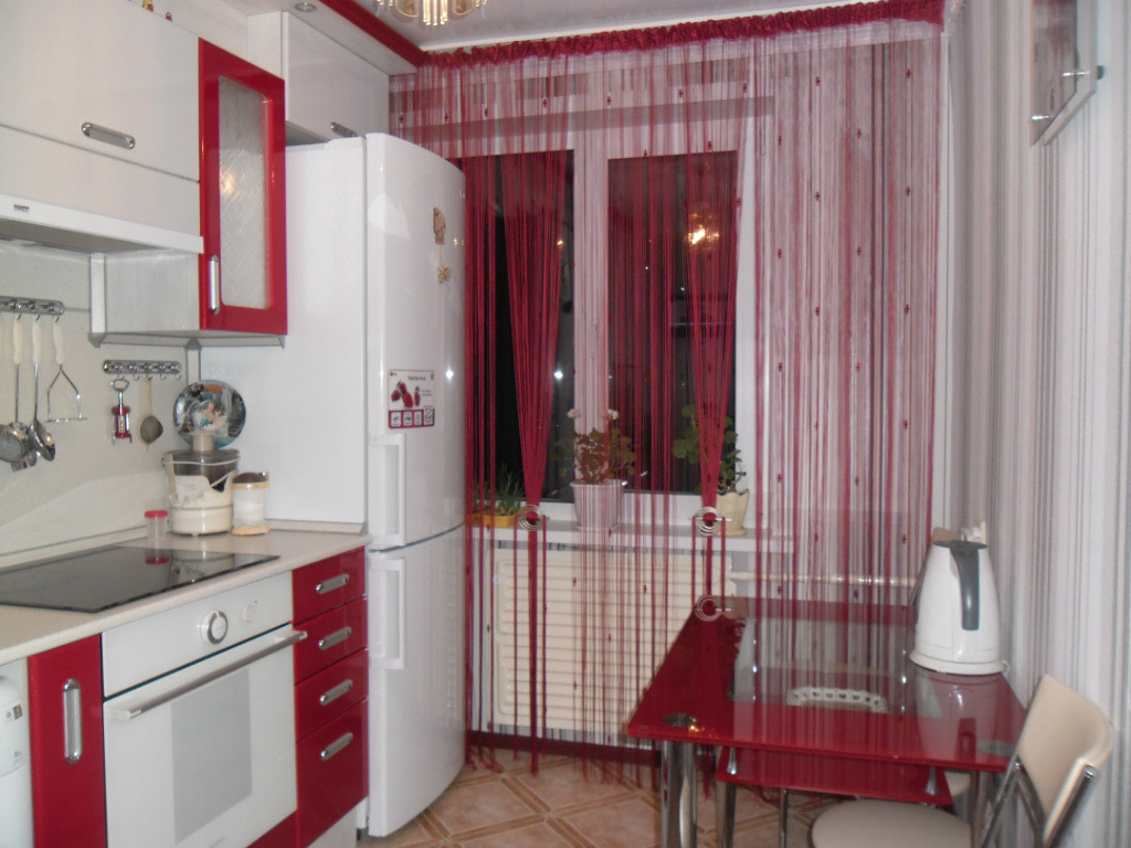 Burgundy textiles look expensive, especially if they are natural, high quality. You can use light tulle or drop-down heavy curtains. The main rule is that large windows are curtained.For a small window and a modest size kitchen, curtains are suitable, complemented by satin ribbons in white or gray.