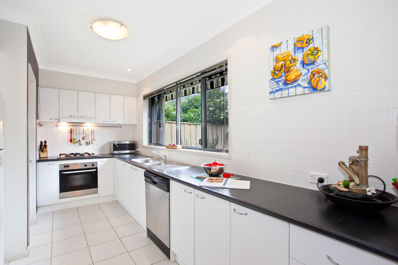 - White kitchen and black floor