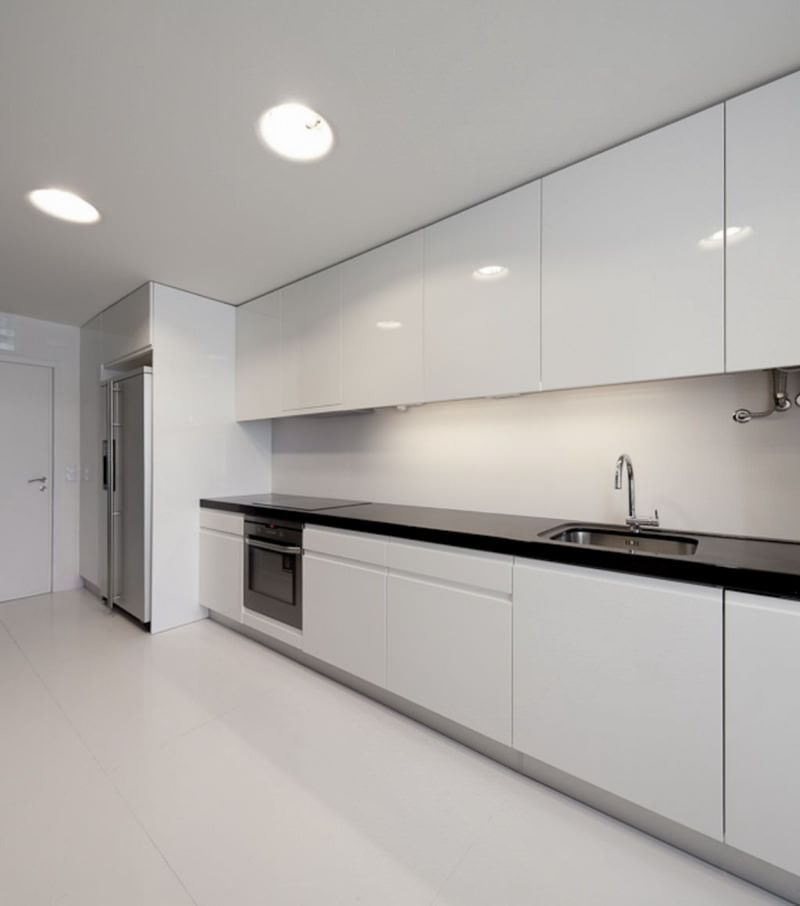- Minimalism. For a small kitchen, this style will be just a godsend. It does not require a riot of decorative elements and elaborate furniture.The headset should be concise, it is better to use the built-in technique. So that the white kitchen does not look too cold and monotonous, you need to add a few bright accents.