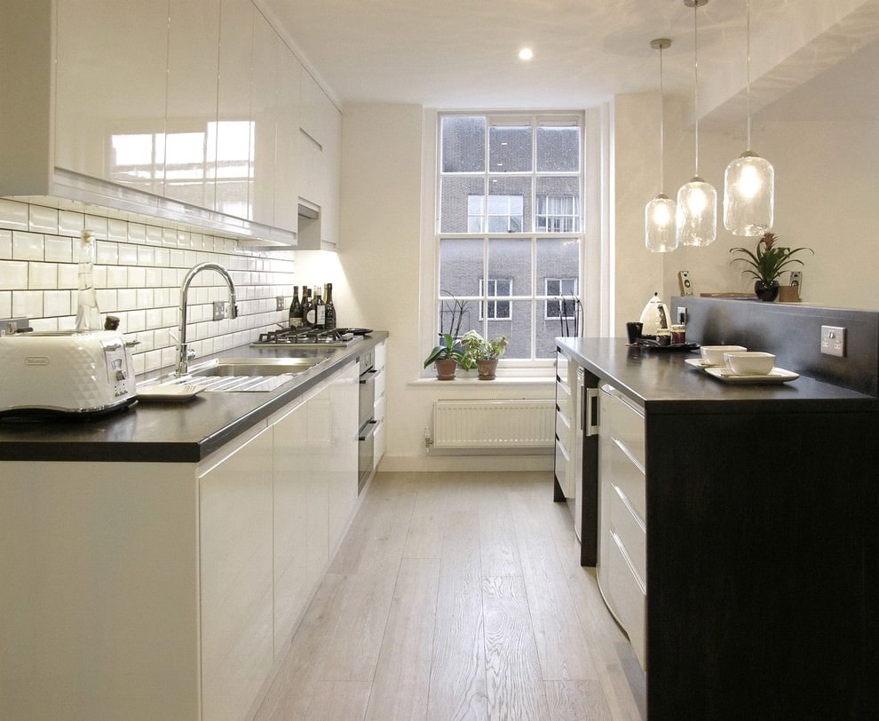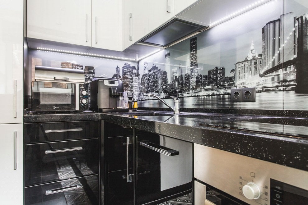 - Visual increase in space. Due to the fact that the dark work surface is on a light (white, light beige or milk) basis, it seems to soar in the air. Such weightlessness looks very unusual. If the countertop itself is also glossy, then the expansion effect becomes even more impressive.