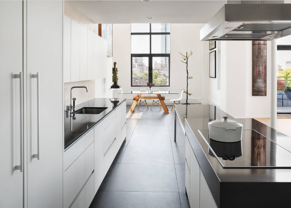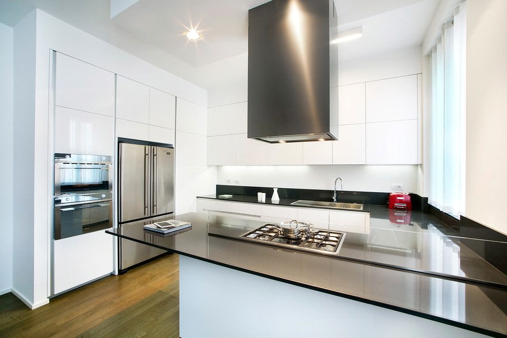 The black countertop is a universal component of the kitchen. It looks great in combination with a room of any color. However, the most contrasting and expressive black becomes in tandem with white. Such a bold design approach, namely a bright kitchen with a dark countertop, has a number of positive and negative characteristics. This is primarily due to the boundary contrast of the two colors. Let's consider them in more detail.
