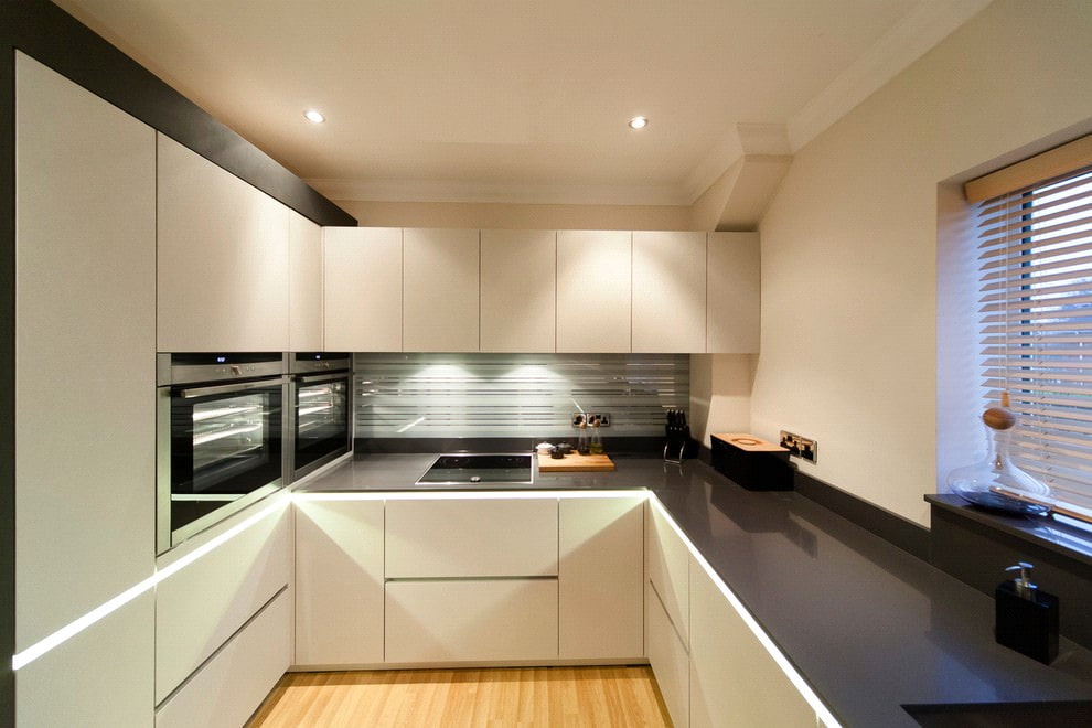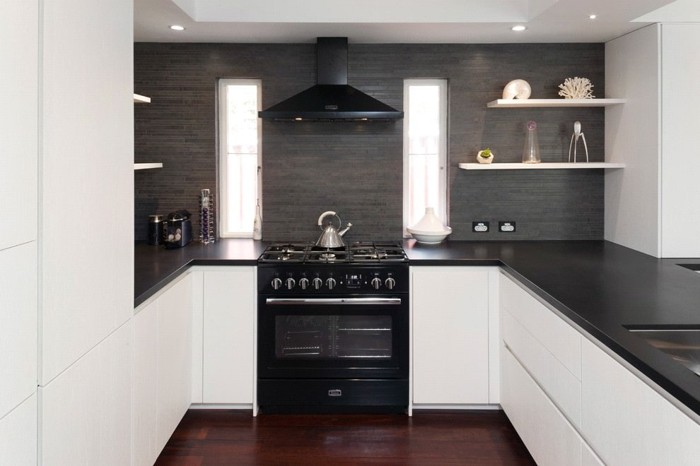 - Universality. The black countertop is perfect for the kitchen in any style and color. It also fits into the space of any shape: L-shaped, U-shaped or with an island surface.