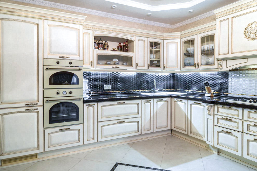 - Classic. Oddly enough, but this style can also be complemented by black furniture. Although it is not the main one, but rather an accent. So black can be an apron or countertop. In this case, any of these elements will be in the spotlight.