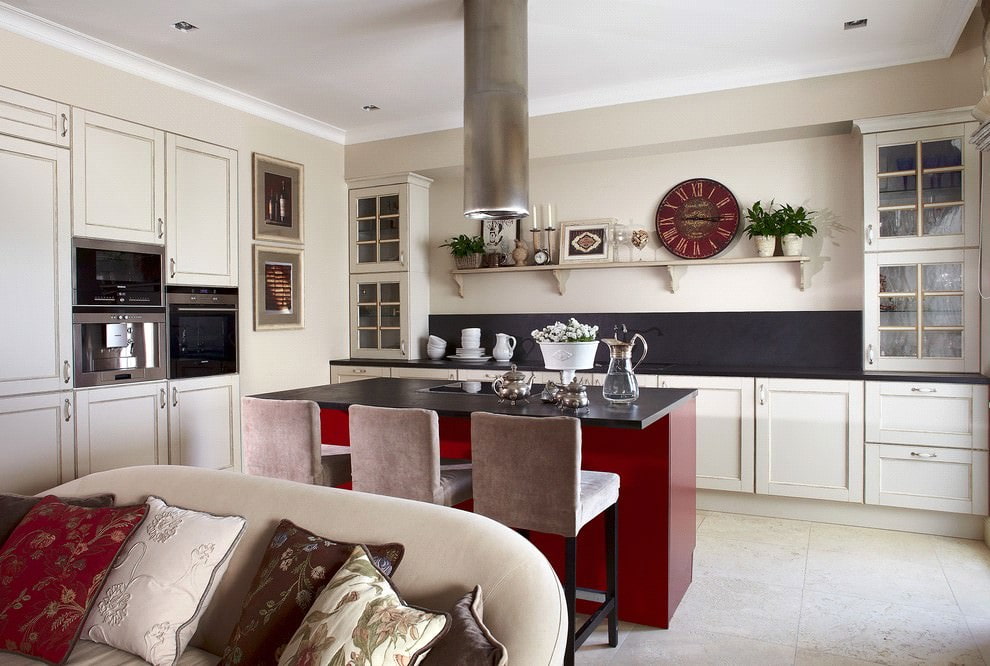 - Red, burgundy. This color is able to bring brightness and freshness to the interior. Most often it is used in decorative elements (tiled aprons, dishes, chandeliers, curtains) and furniture (chairs and pouffes). Red or burgundy color will be the highlight in the white kitchen of any style with black appliances.