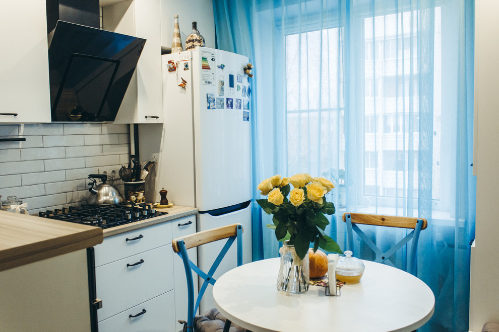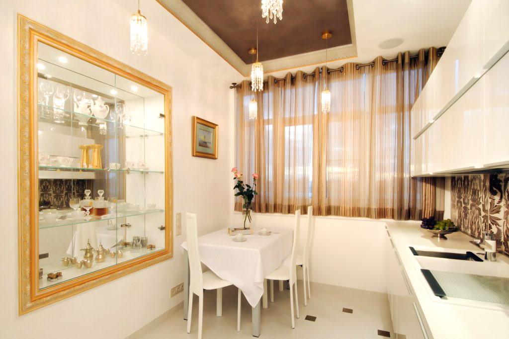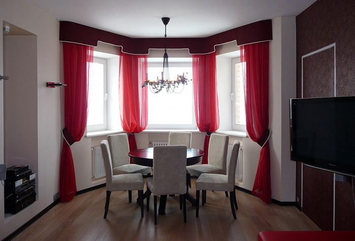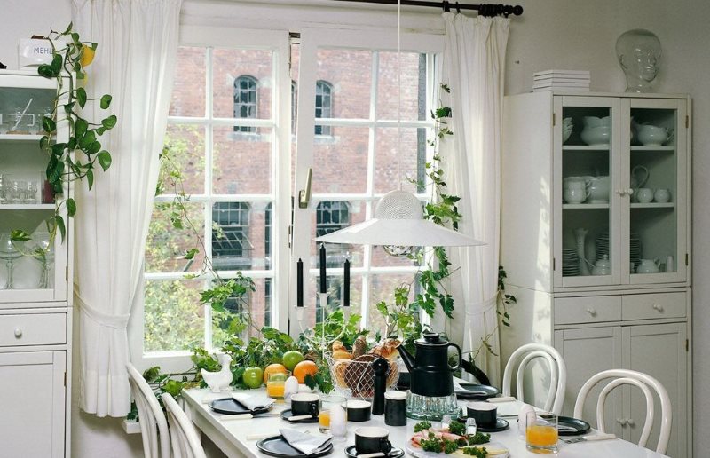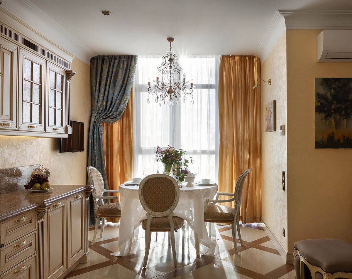 Long curtains will be very useful in the dining area of the kitchen