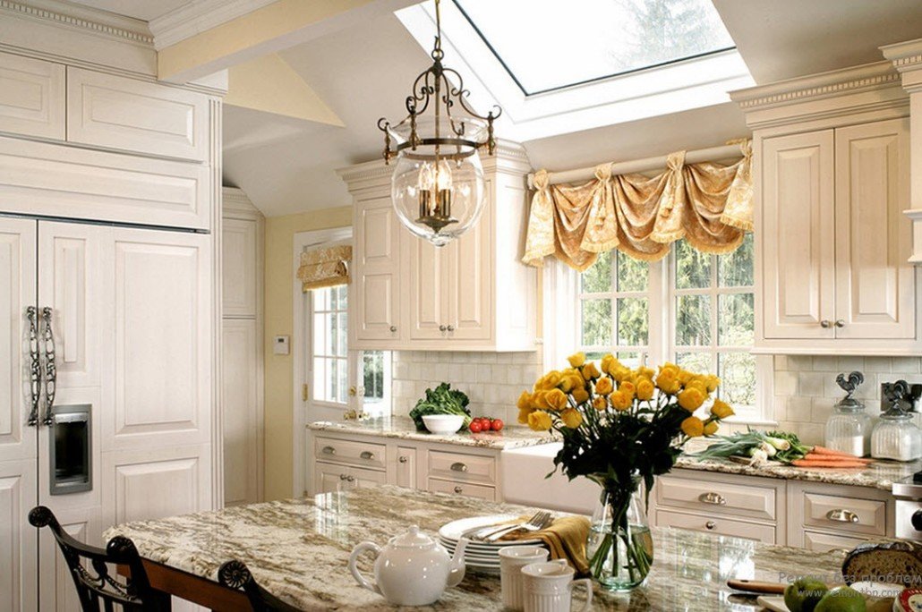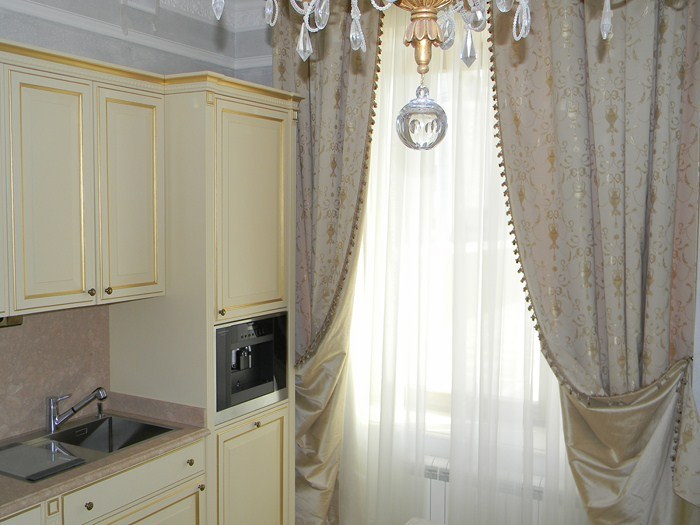 Add some imagination to your formal kitchen with airy tulle curtains to the middle of the window, picked up in the form of flashlights, which will make them original. The more fabric will be collected in flashlights, the more magnificent and elegant they will look.