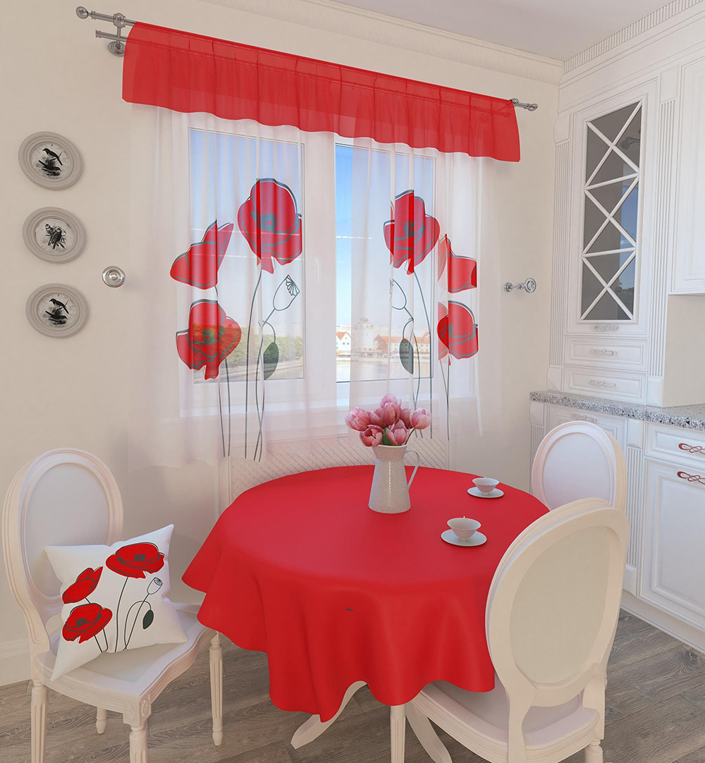 If you take a set of two window tulle curtains, they will simultaneously decorate the room with their simplicity and transparency, and allow sunlight to freely illuminate the kitchen room, fulfilling its functionality. Visually increase the room and the feeling of space. The same applies to one continuous tulle web over the entire window. Usually, for a tulle to look magnificent, its width should be three times the width of the window itself.