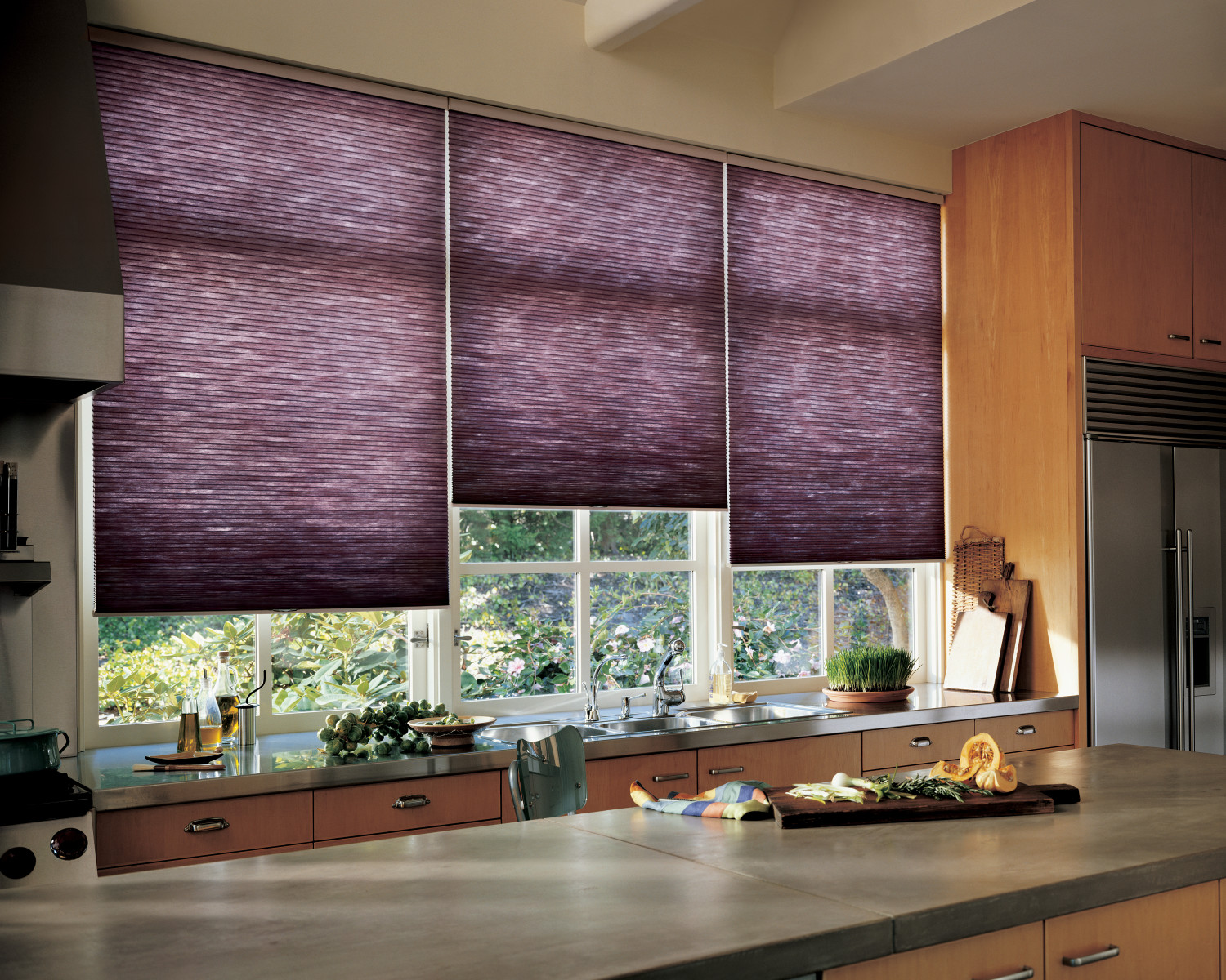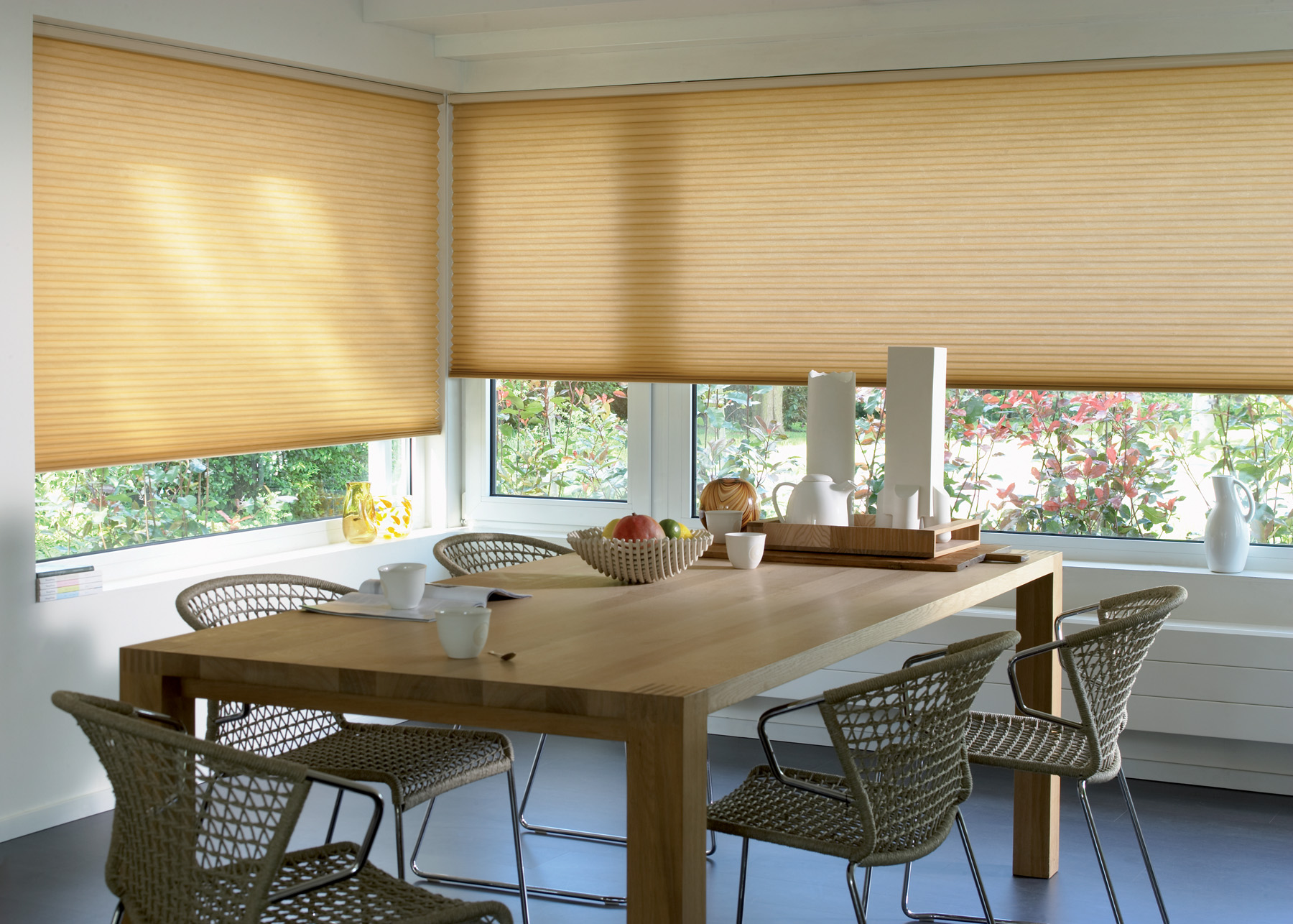 If necessary, transparent short curtains can be complemented with pleated curtains.