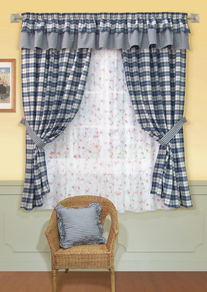 - Cotton. Cotton drapery curtains are very popular both in appearance and in functionality. You may not need to iron the cotton fabric curtain. There are different density cotton fabrics - from the lightest to the most dense. To give the kitchen room, a light, translucent cotton is suitable. Advantages of thicker cotton - keeps its shape better, serves as more reliable protection when sunny days, is an additional soundproofing, heatproofing protection. Kitchen curtains are often rusticized using a small flower or cage. Manufacturers of cotton fabrics provide a wide selection of colors in the style of "country".