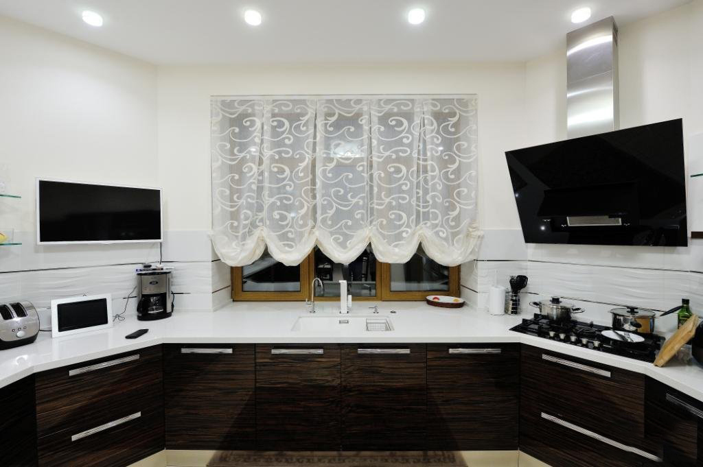 Curtains richly decorated with ruffles, especially when it comes to a work room such as a kitchen, go by the wayside. What changes have occurred in the design of the kitchen interior, see our collection of photos.