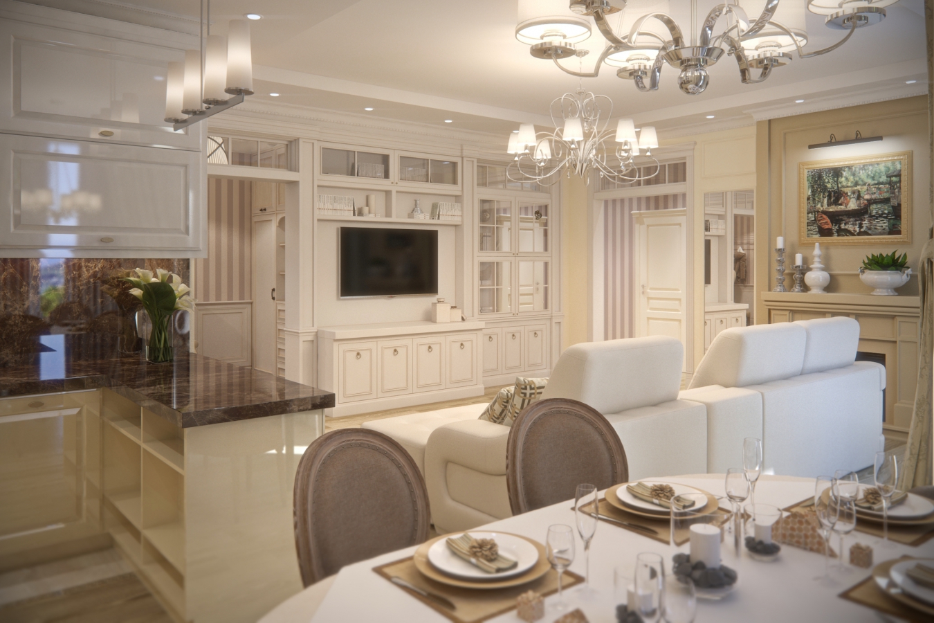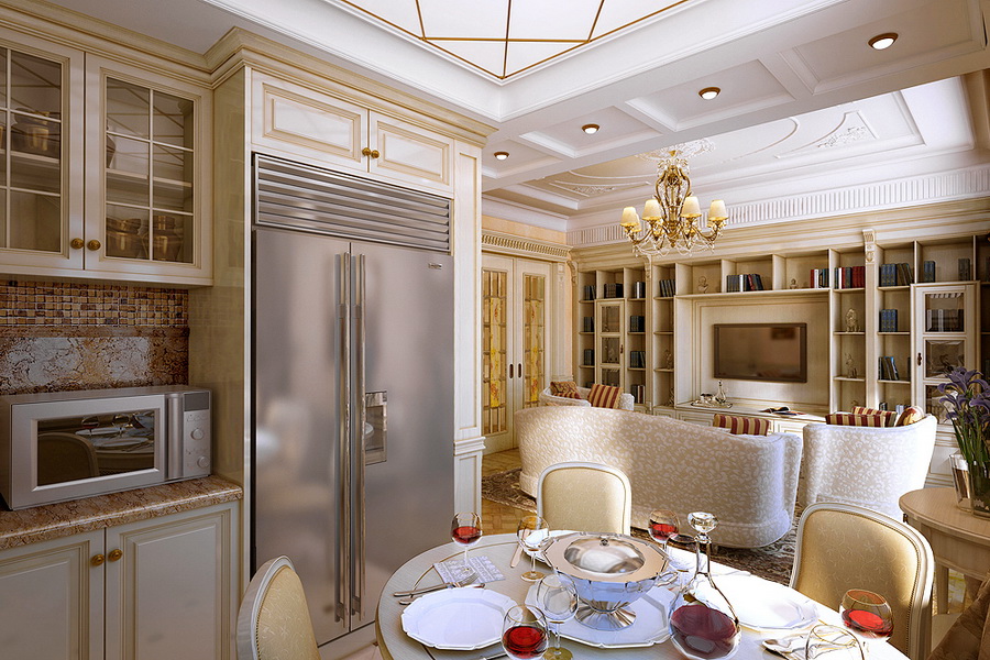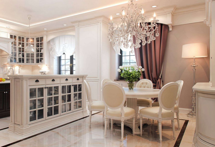 The kitchen, combined with the living room, in the classic style is associated with a white and gold decoration, which makes the interior elegant and festive. But now the classic style often has soft and noble shades: beige and gray. These colors look noble and elegant as well as the main white color. These soft shades make the room more pleasant and homely. In the classical style, warm tones with bronze, copper and gold decors are required.