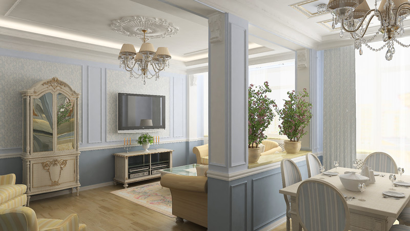 For visual expansion and delimitation of space, various shades and finishing materials are used. But in the classical style it is worth using only two or three tones. The border between the combined kitchen and the living room is highlighted using a molding or a border, provided that the wallpaper in both rooms is the same.