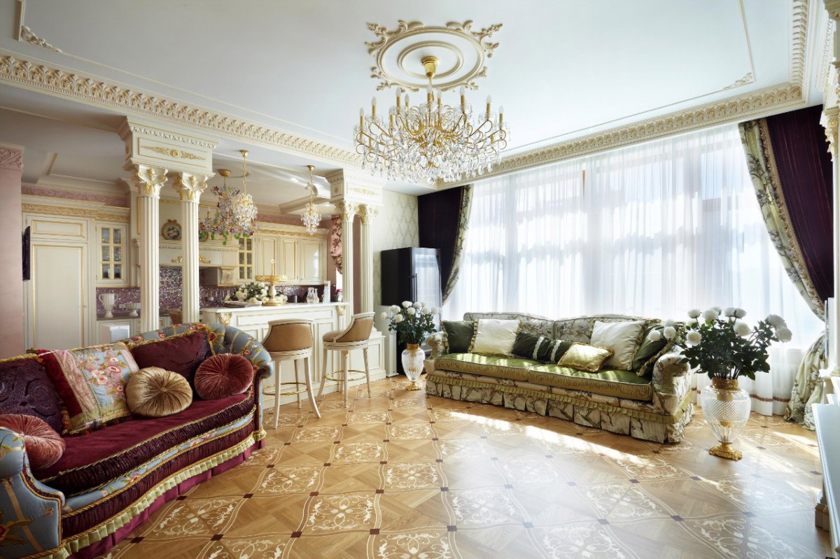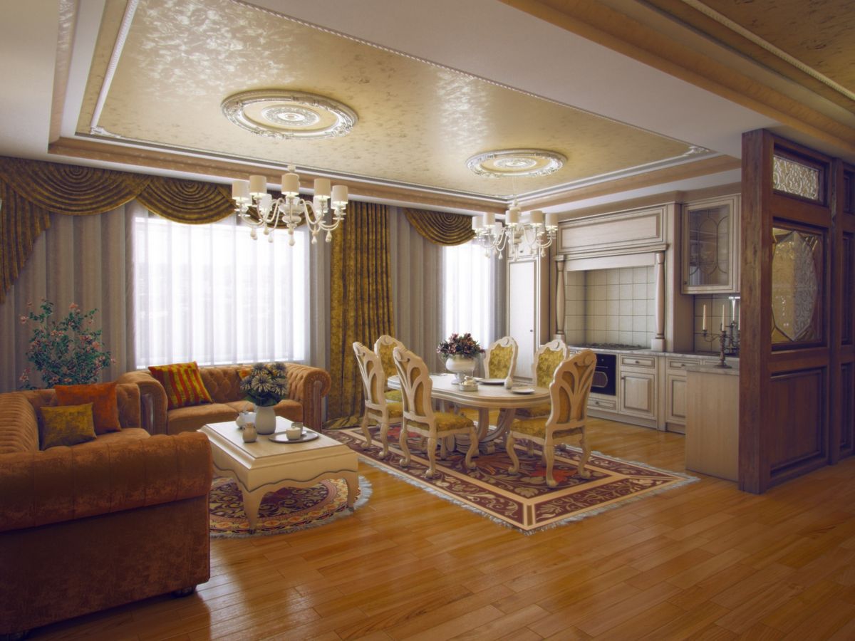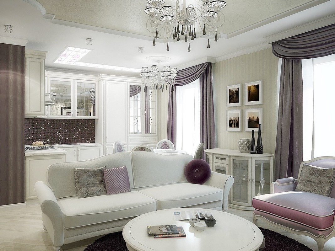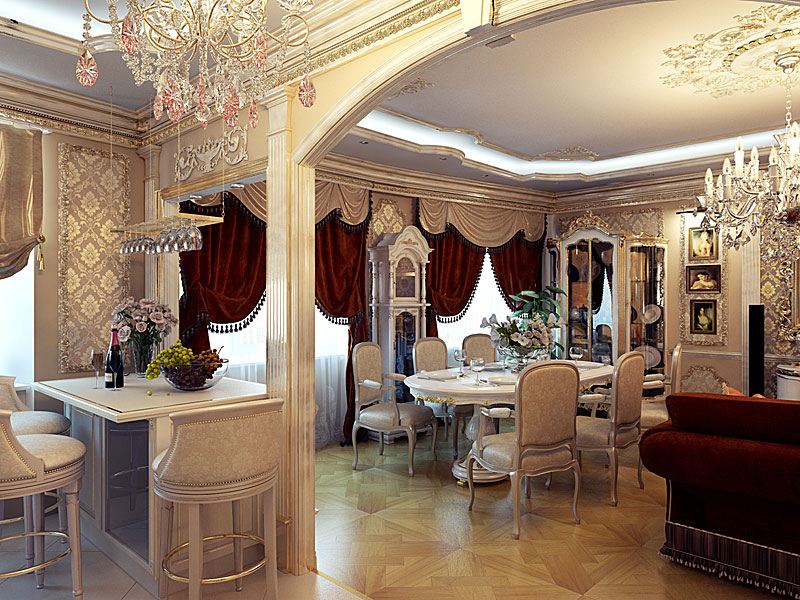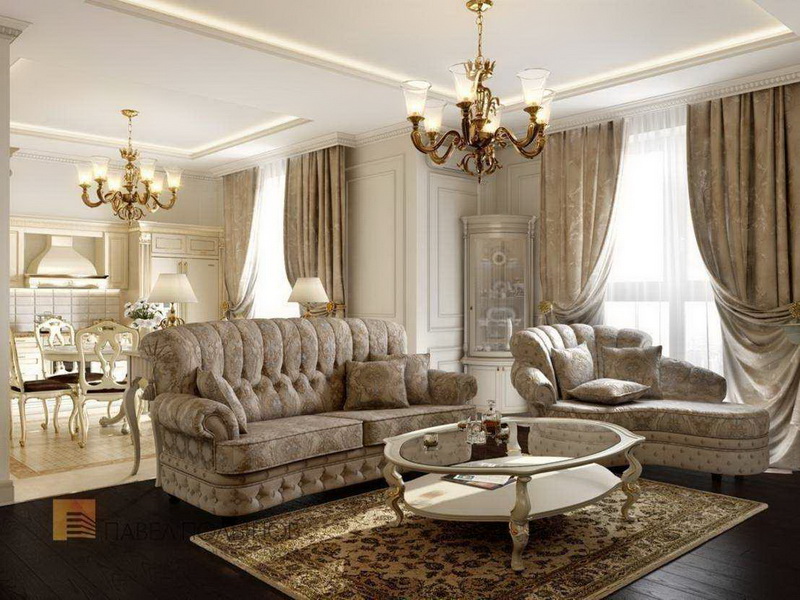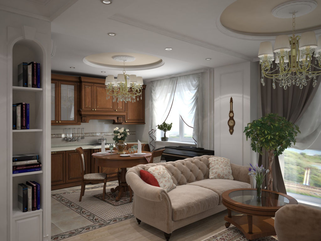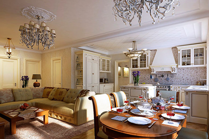 The interior of the kitchen-living room in the classical style should provide maximum comfort and aesthetic pleasure, therefore, the furniture is used expensive and solid, and textiles made of luxurious fabrics: brocade, velvet, satin, velor.