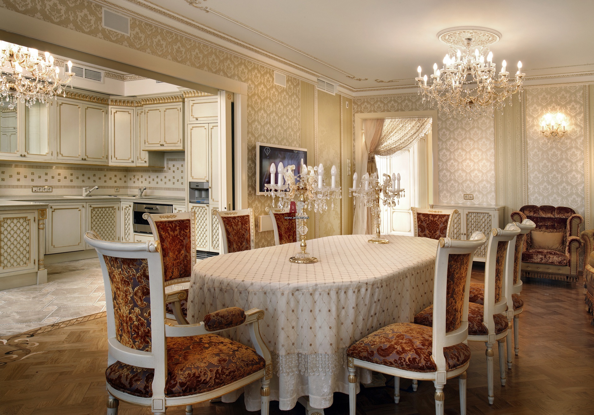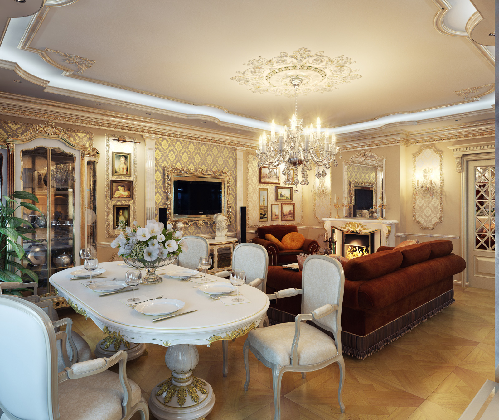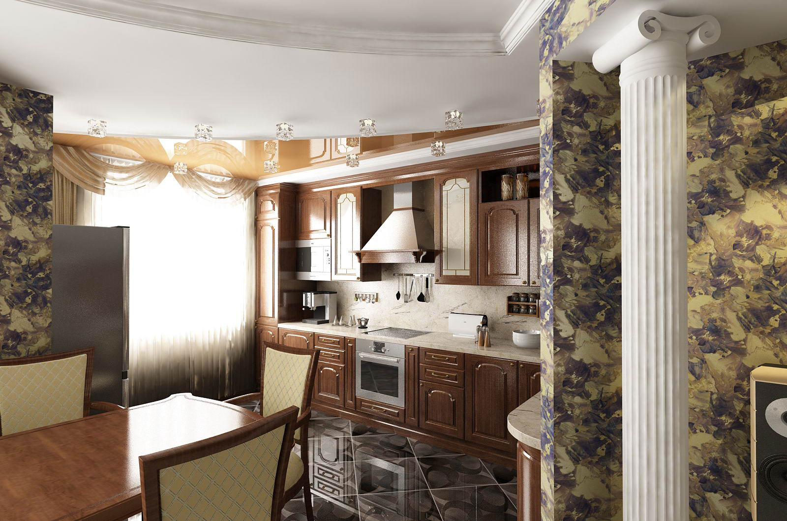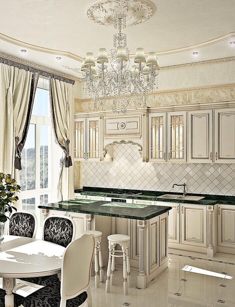 The interior of the kitchen-living room in the classical style should provide maximum comfort and aesthetic pleasure, therefore, the furniture is used expensive and solid, and textiles made of luxurious fabrics: brocade, velvet, satin, velor.