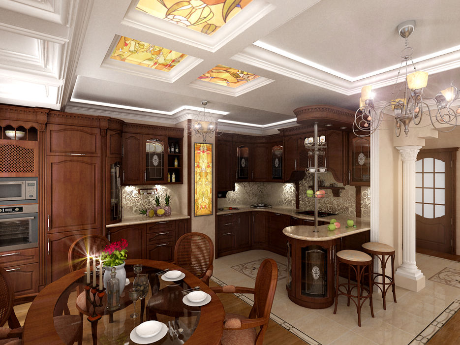 The design of the classics is striking in its quality, perfection and traditions. High ceilings, huge stained glass windows, a gentle and solid color palette, reliable furniture - this is the true embodiment of the classic style. The main feature is natural wood products or its imitation.
