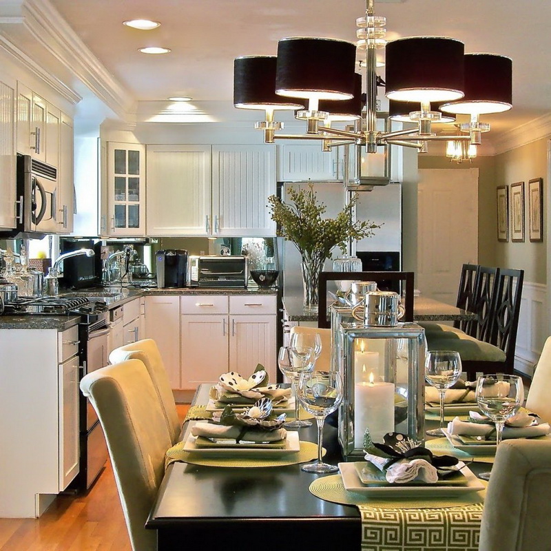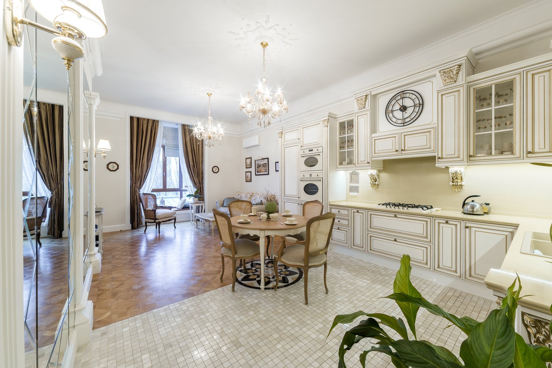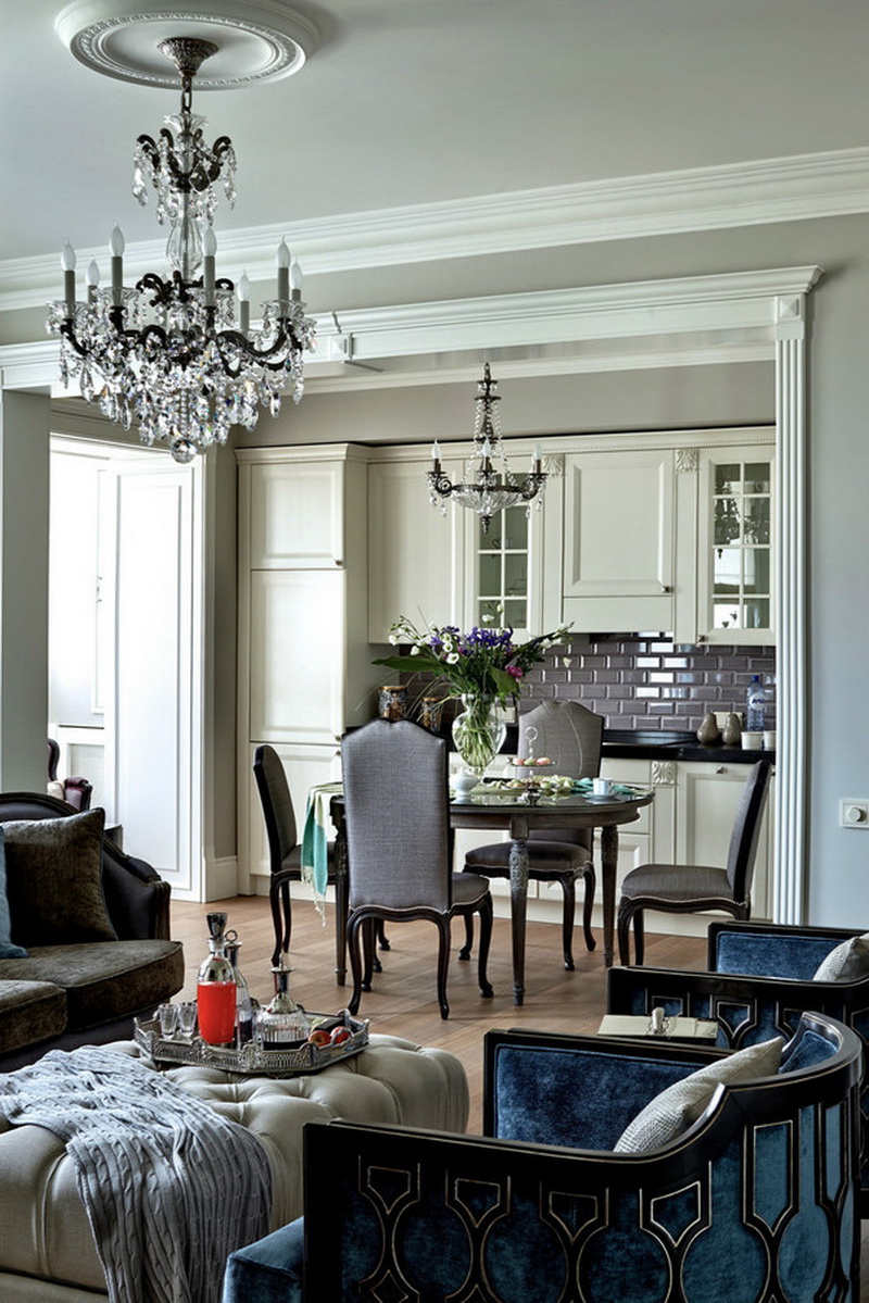 Graceful shapes, restrained colors and symmetrical lines are the hallmarks of the classic design of the kitchen-living room