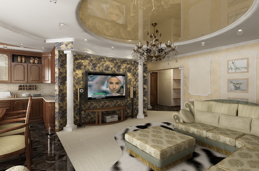 The decor of the ceiling depends on the size of the room. Volumetric stucco, gilding and huge chandeliers are permissible only in really large rooms
