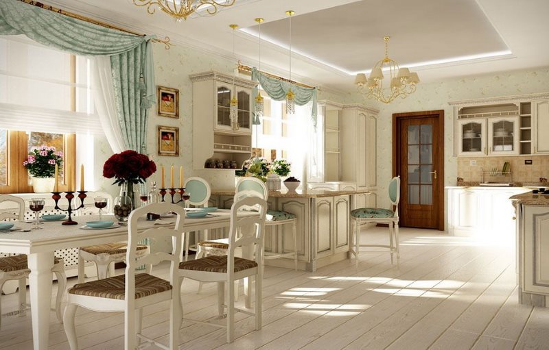 If the kitchen is framed in white or pastel, then it is possible to use a bright spot in the style. The furniture should be made of expensive wood with a variety of monograms and forged legs, and the textiles on the windows should be made of natural fabric. You can combine the curtains with a thread of glass balls and use it as a delimiter.