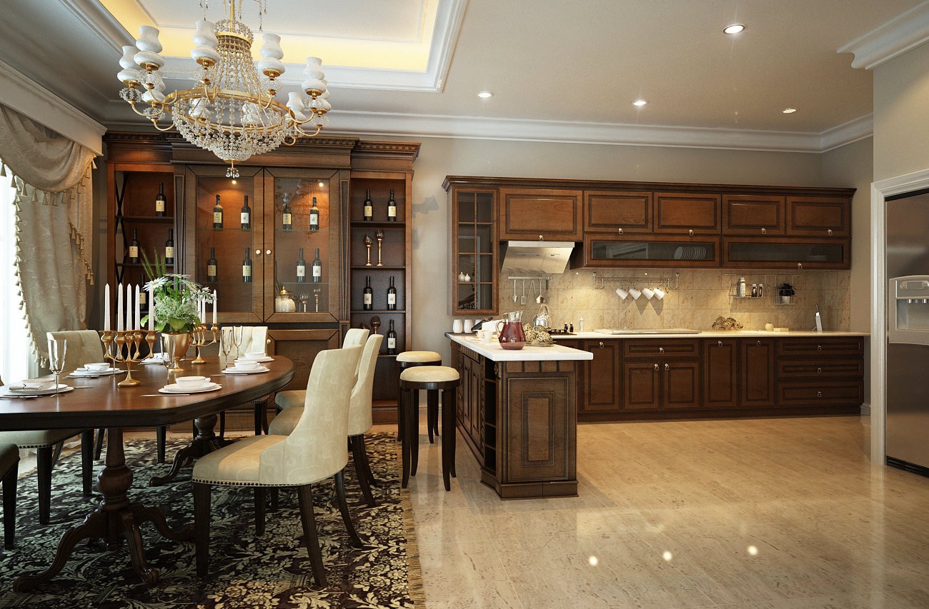 The classic style of the kitchen involves the presence of wooden furniture, elegant accessories, expensive decor items. This design is ideal for a kitchen combined with a living room; it will make the room elegant, aristocratic and luxurious.