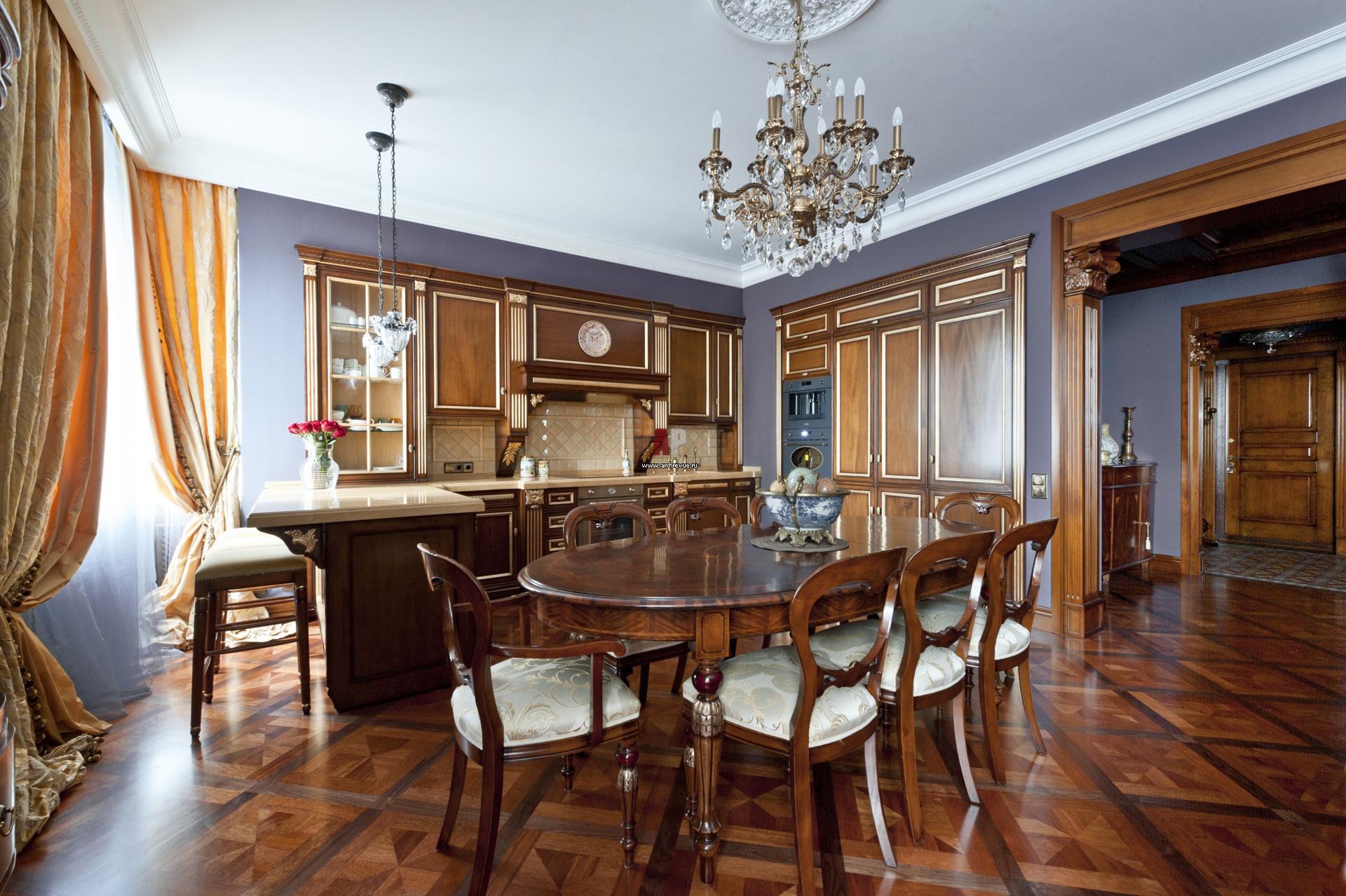 The wall for the kitchen-living room in the classical style is almost always natural wood, in extreme cases - high-quality imitation