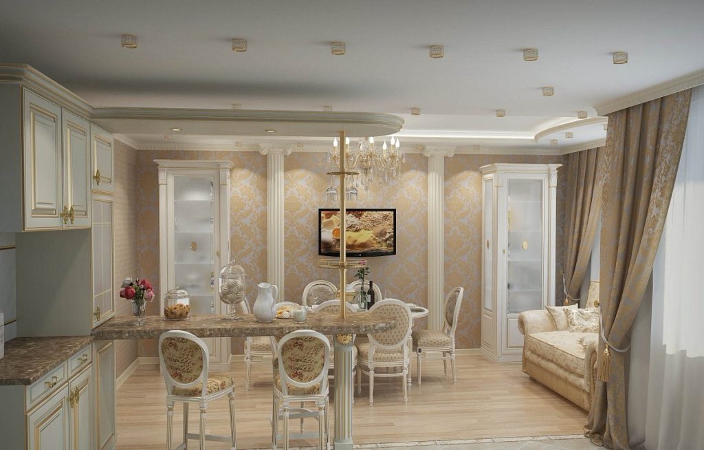 Classic is always in fashion, it is popular now, at the time of a variety of styles, so designers are actively promoting the classic style in the interior of the room. The kitchen-living room in the classical style is especially charming and elegant in its execution.
