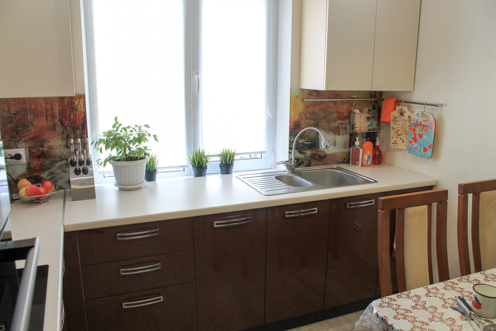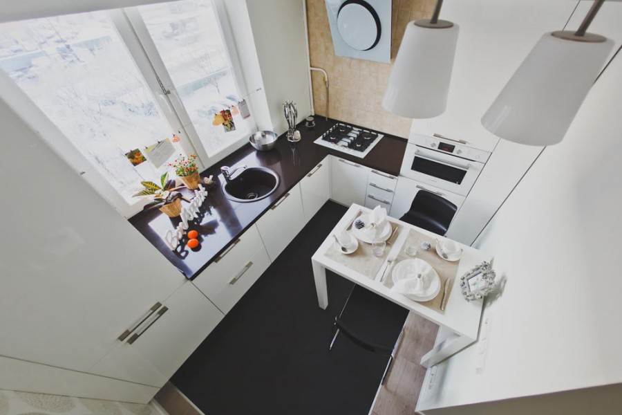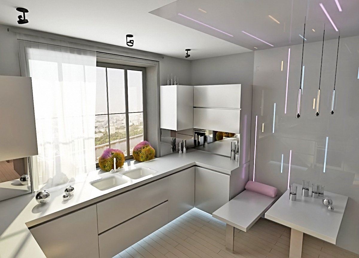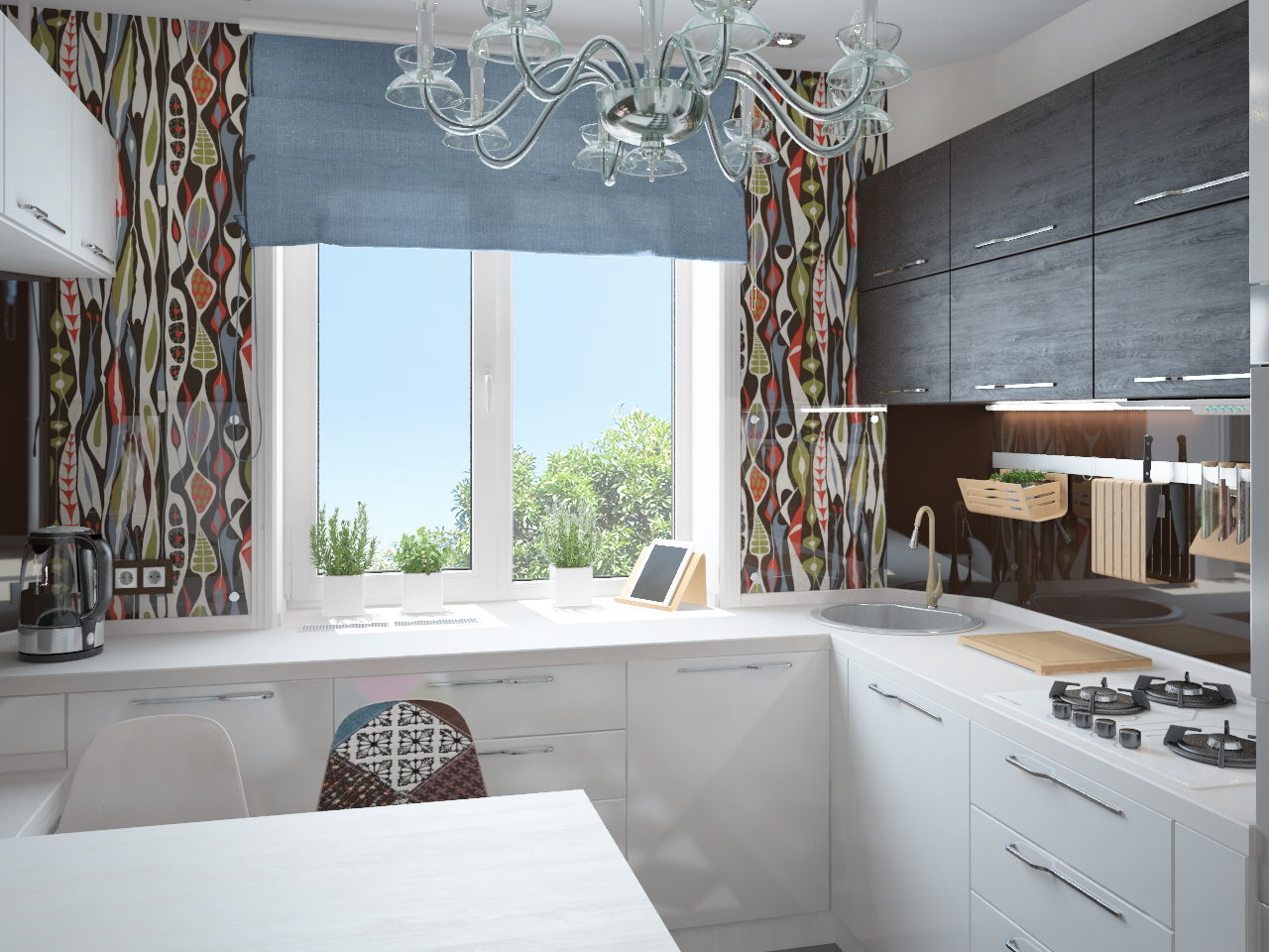 There are drawbacks to the location of the working area at the window, but they are neutralized by a huge number of advantages. Enjoy the beautiful views and prepare culinary masterpieces for your loved ones.