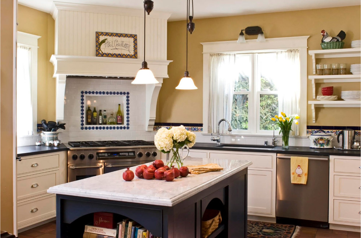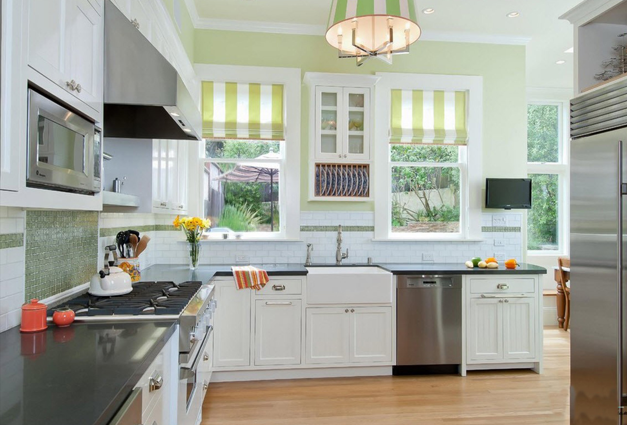 Most often, when using a country style, preference is given to natural materials and light shades. You can use open shelves with real plants, a combination of a print of stripes and peas, white and sky blue.