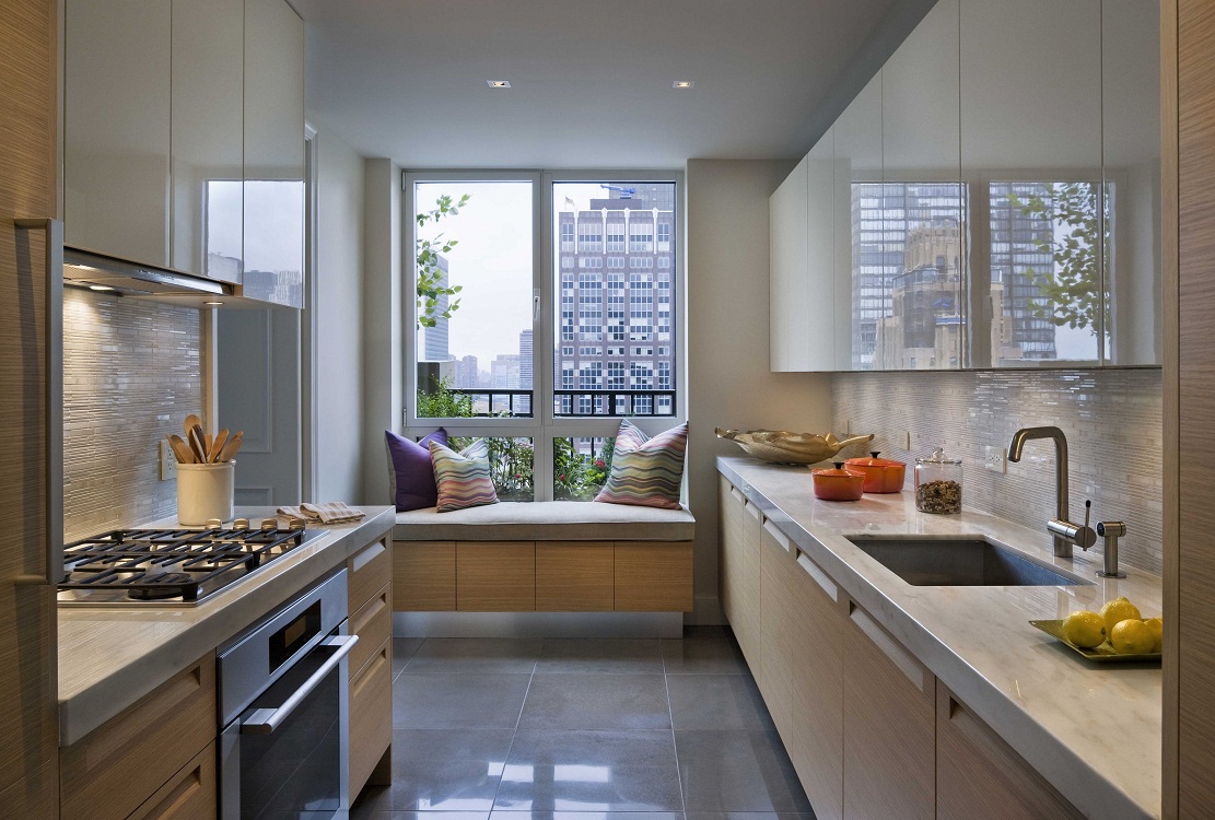The kitchen near the window is very convenient, because you can watch what is happening outside the apartment. Under the windowsill, you can organize an additional place to store kitchen utensils. Especially for elongated kitchens, it is important to place a dining area or work surface.