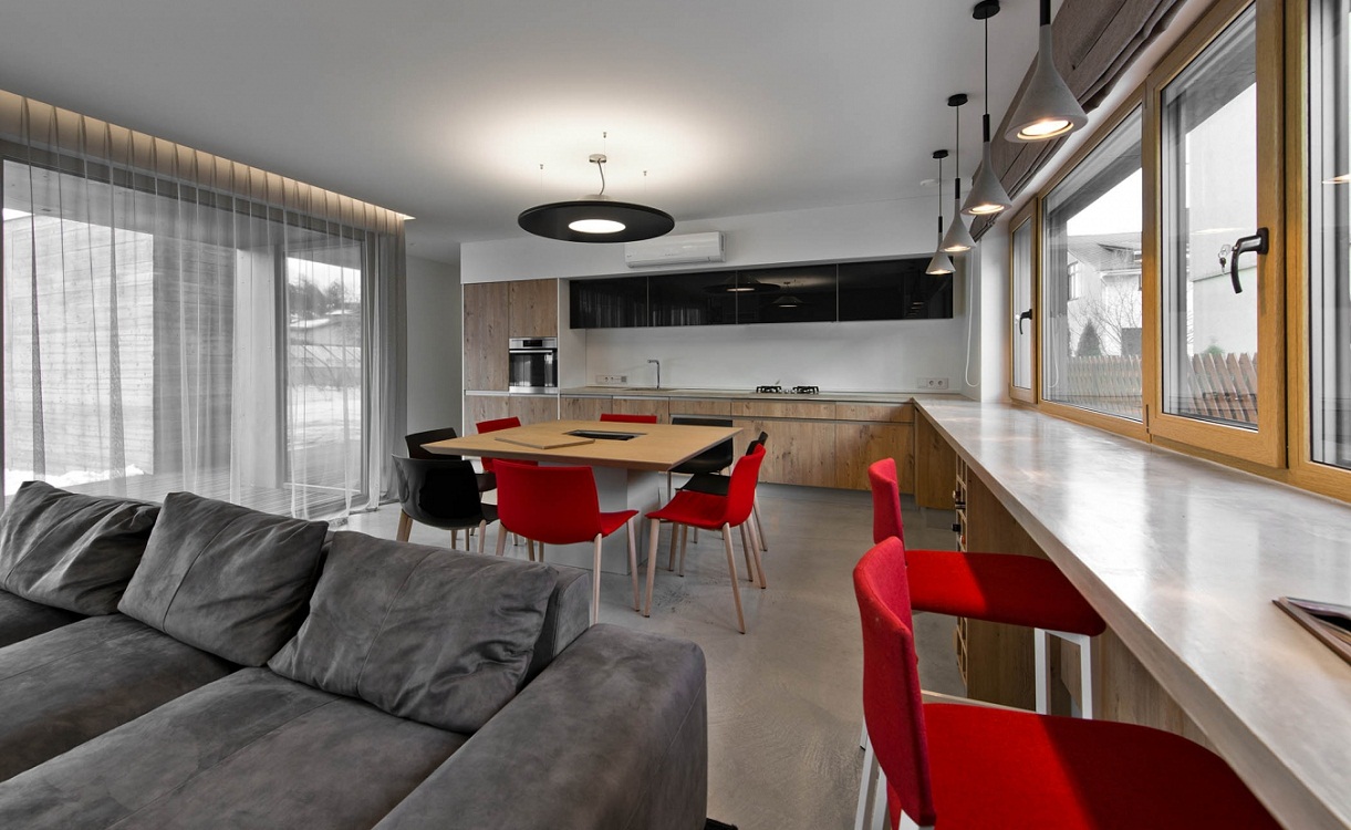 Most often, an apartment with panoramic windows has a dining area in the kitchen so that every member of the family can enjoy beautiful scenery while eating. Large window openings - this is a great opportunity to be in the kitchen and do your favorite household chores, while not using additional lighting.