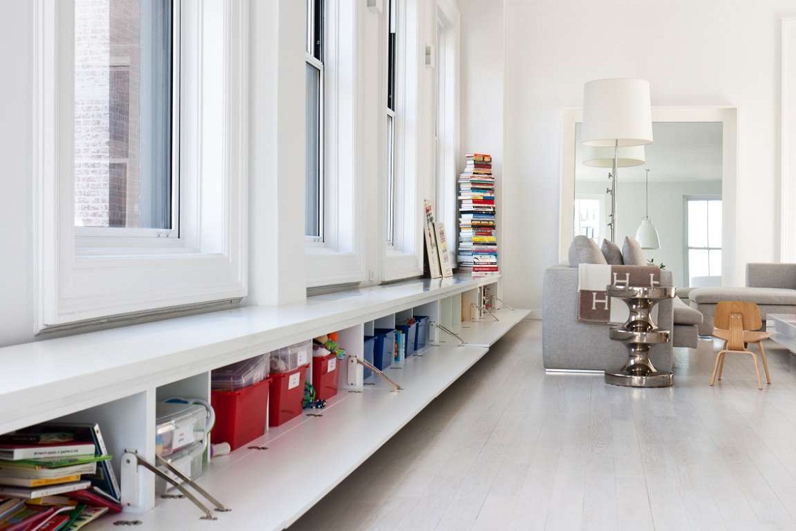 The space around can also be used to good effect. A great option to place the storage system under the windowsill and along the entire wall.
