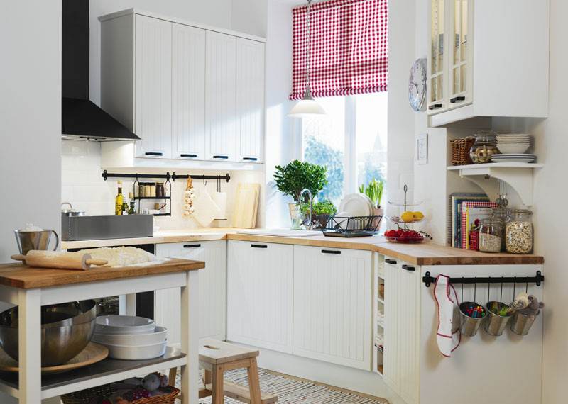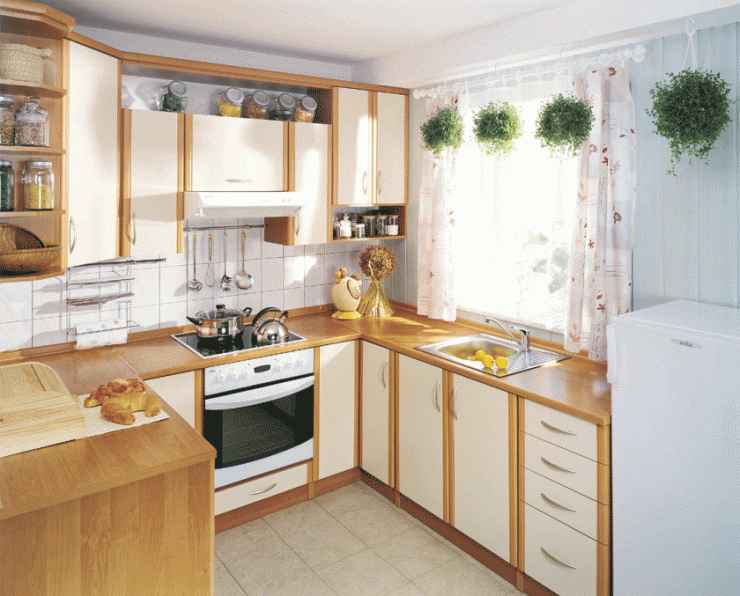 A corner kitchen with a window in the working area is the best option for placing furniture in a small room. Using this simple technique, you can significantly increase the area of the room visually. A sink located on the battery can mask the heating system.