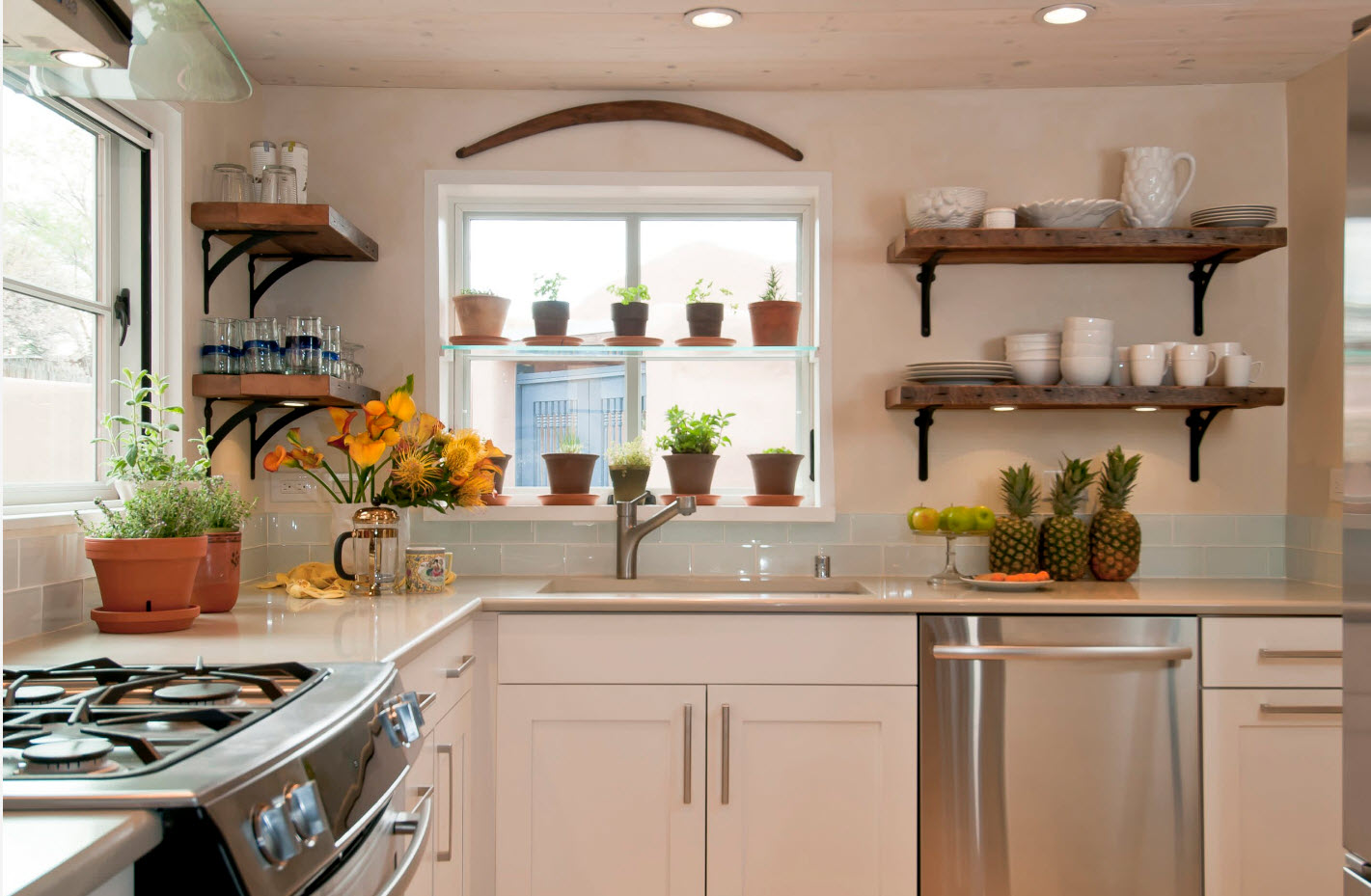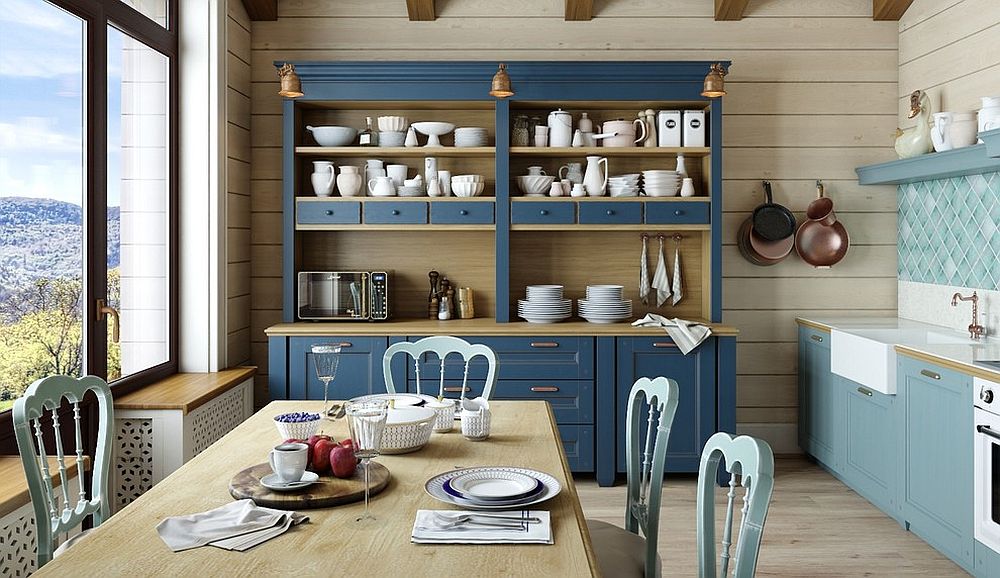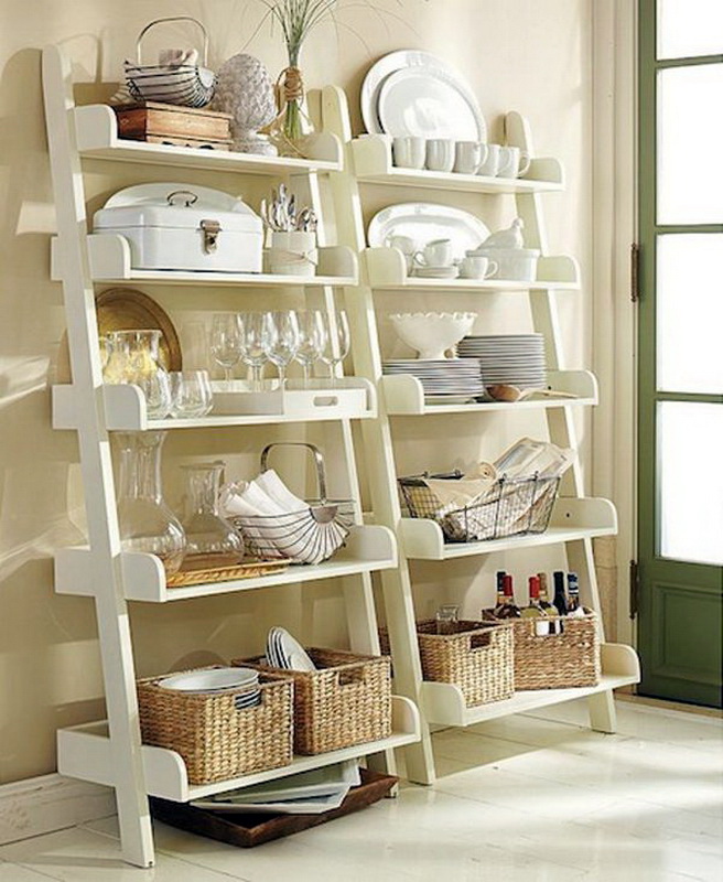 Sophisticated shelves will help to sparkle the kitchen with new colors. On such comfortable pieces of furniture you can put original dishes, small vases with wildflowers, as if delivered from the south of France.
