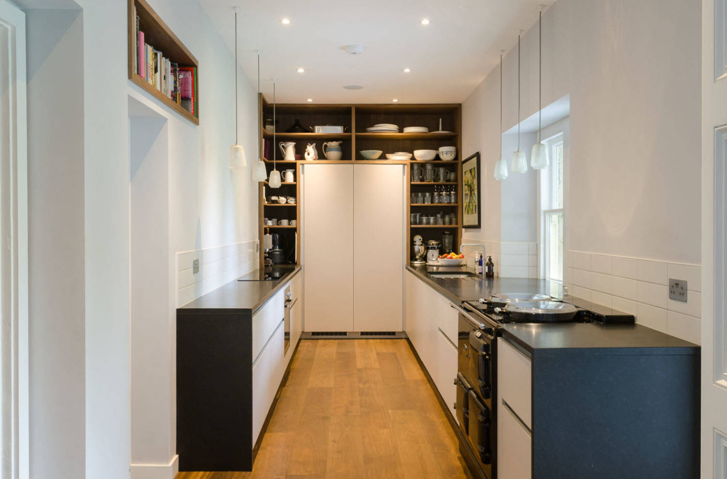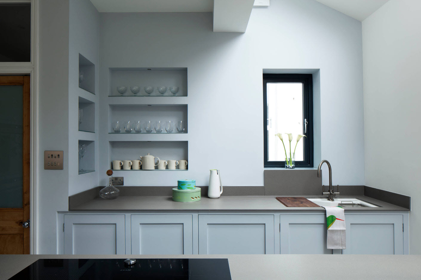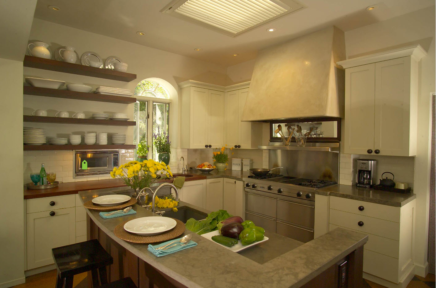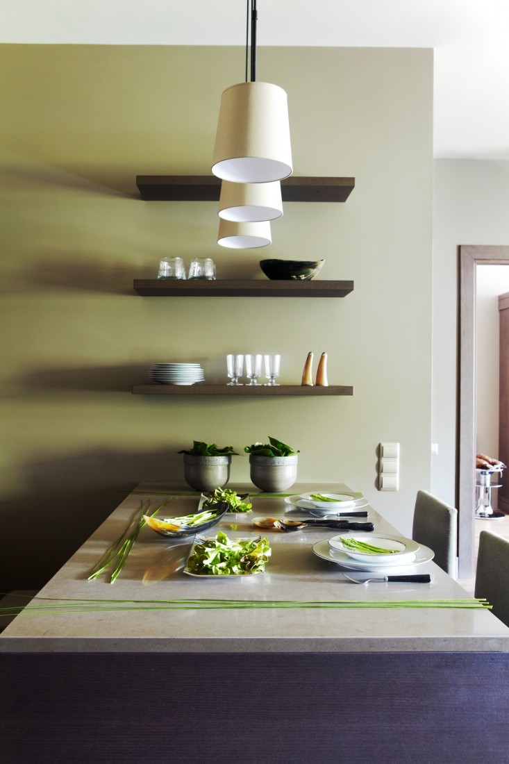 The functional location of the shelves above the table level divides the kitchen into separate zones.