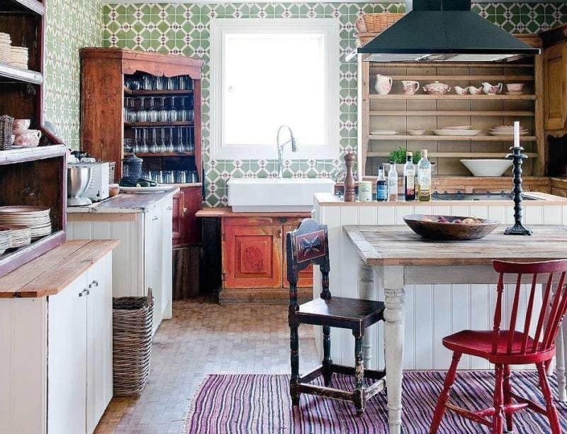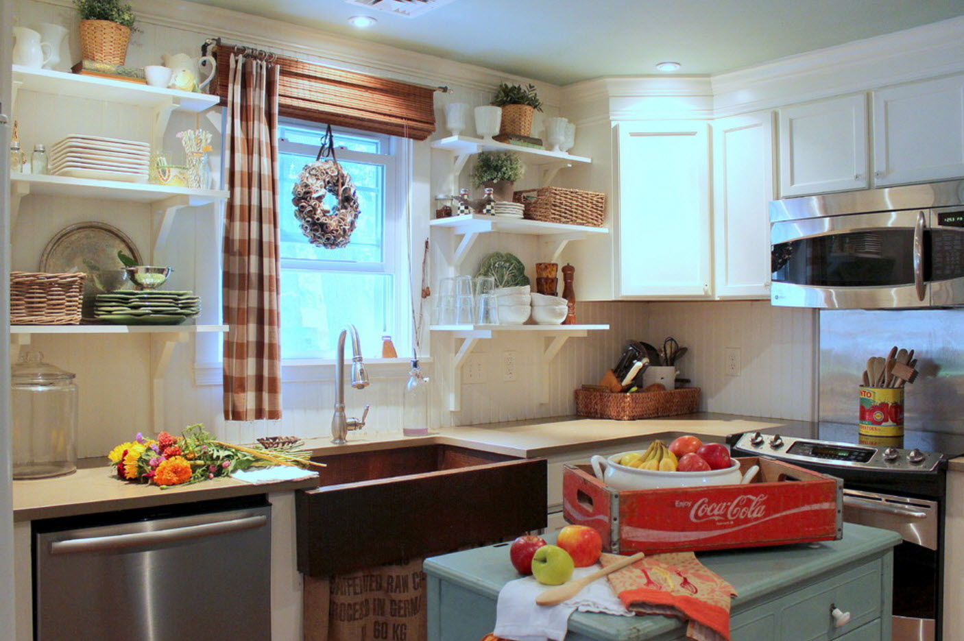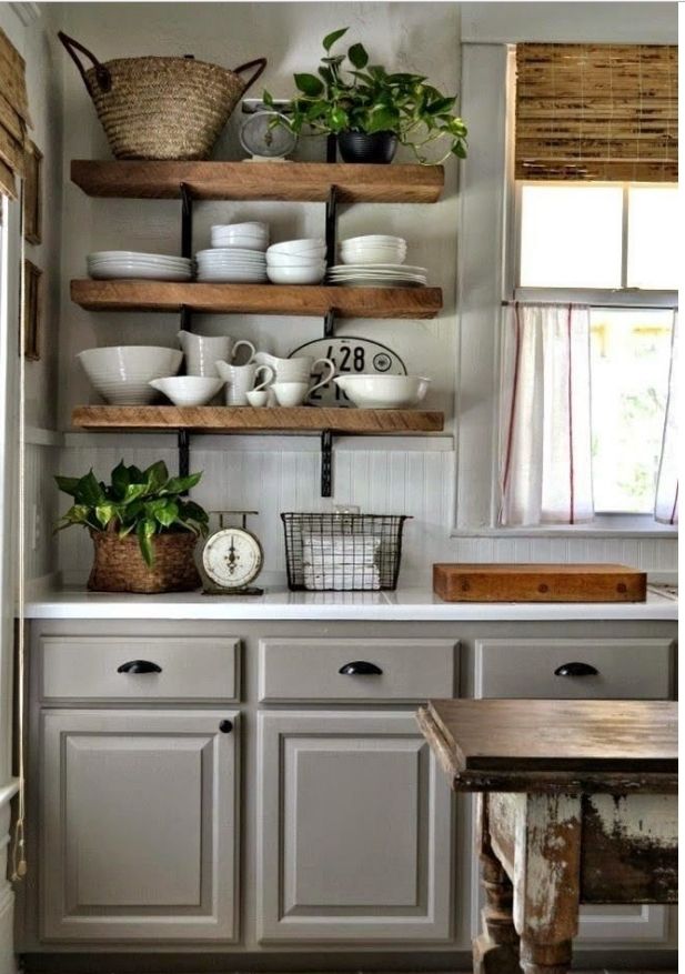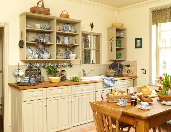Functional shelves made of natural timber will be required. Shelves are beautiful in the kitchen, made of solid, aged wood, complemented by wicker baskets, chests. The color palette is better to choose shades: light beige, gray, pastel colors.