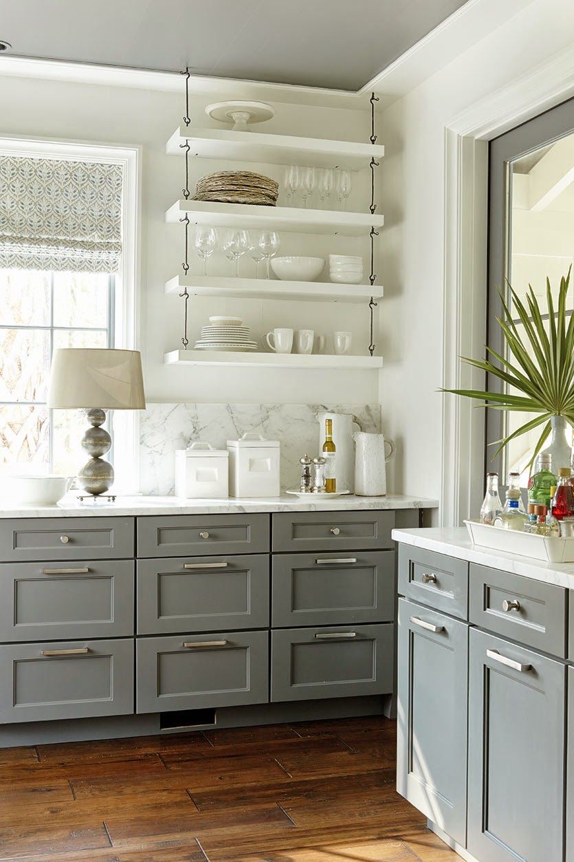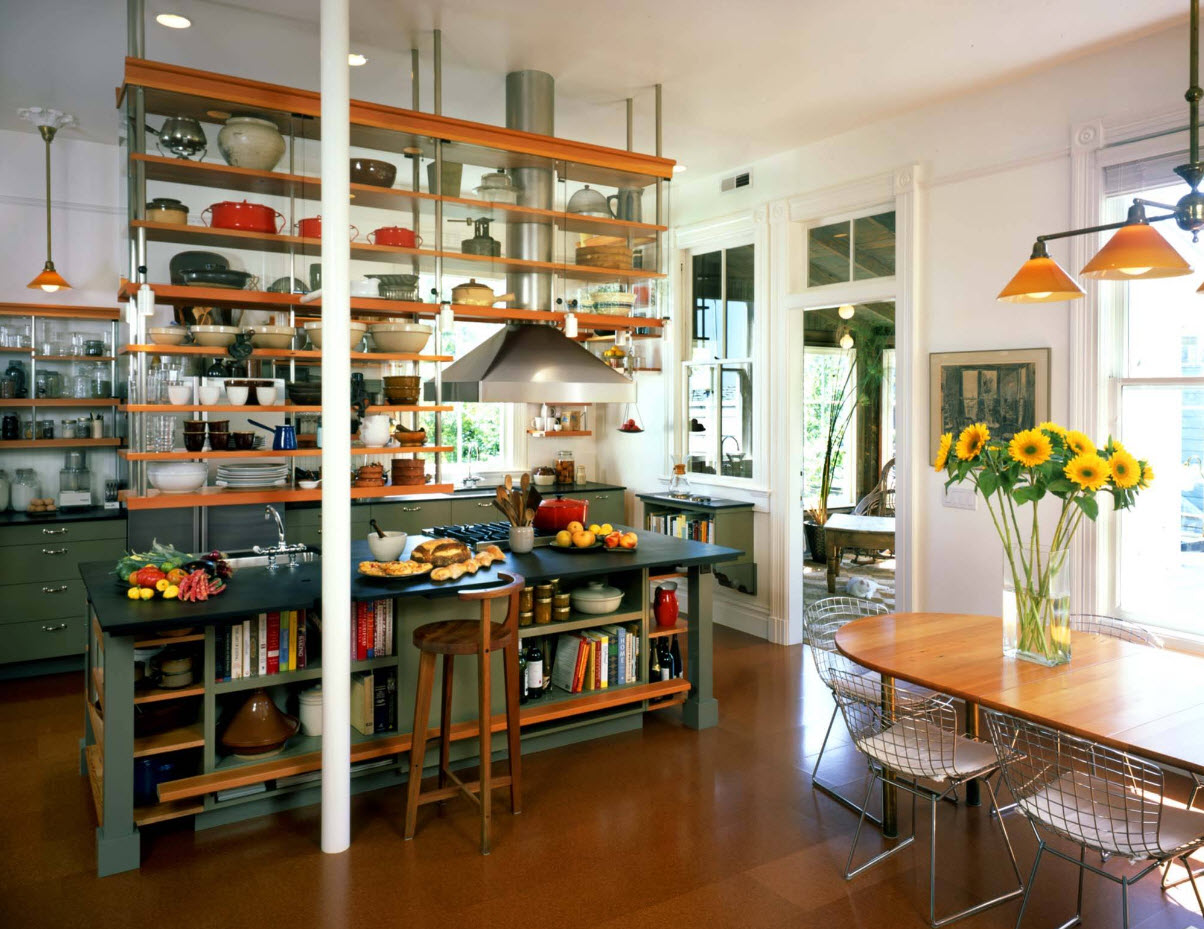 Shelves suspended above a table or island will divide the kitchen into two parts