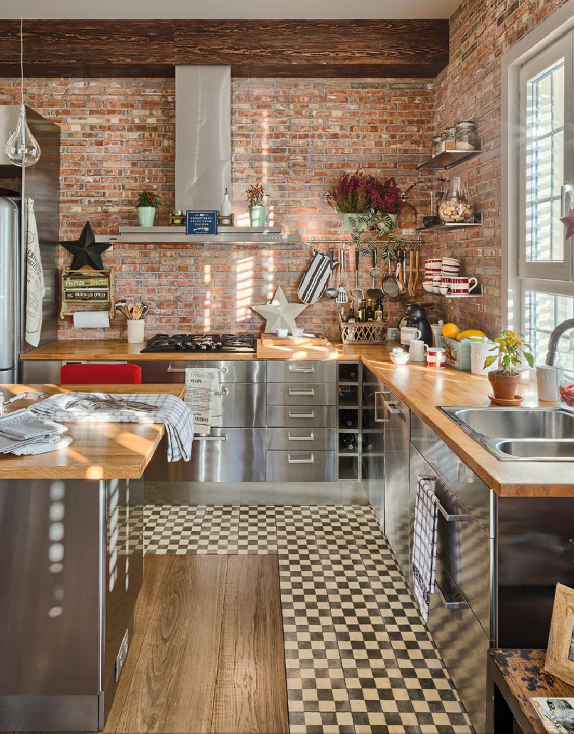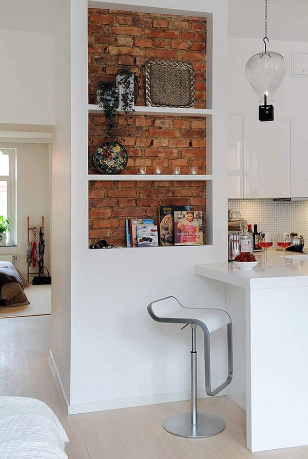 Wooden shelves are in perfect harmony with brickwork or “boar” tiles
