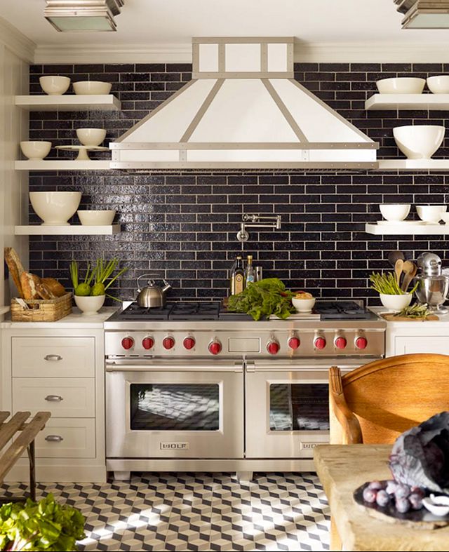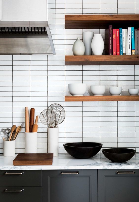 Wall-mounted shelves can be used instead of kitchen cabinets or can be a spectacular addition to closed storage systems