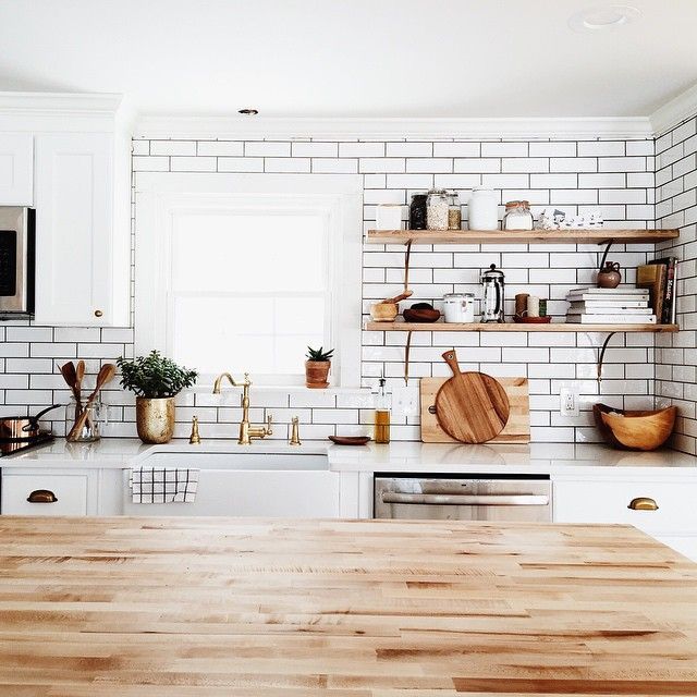 An inexpensive option for making shelves. Products made of wood boards look in the kitchen interior as an independent element.Racks will help to place kitchen utensils: dishes, jars with cereals, spices. They are durable, reliable, low cost.