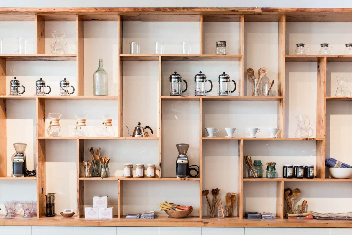 Modular shelves made of laminated particleboard effectively placed on the white wall of the kitchen