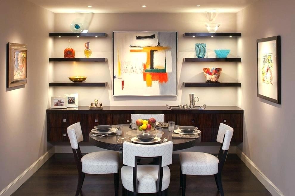 Creating a cozy atmosphere, comfort is possible with the help of decorative shelves. You can also put practical gizmos on them. This is a full-fledged complex, adhered to in one subject, for storing serving sets, figures, flower arrangements.