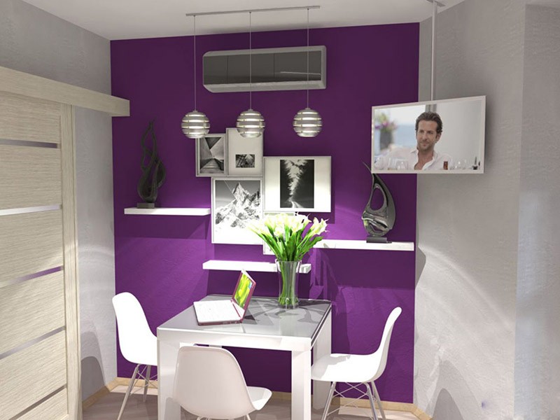 The walls planned for the placement of the shelves perform a monophonic structure. Finishing materials: ceramics, tiles, plastic, gypsum panel, plain wallpaper.