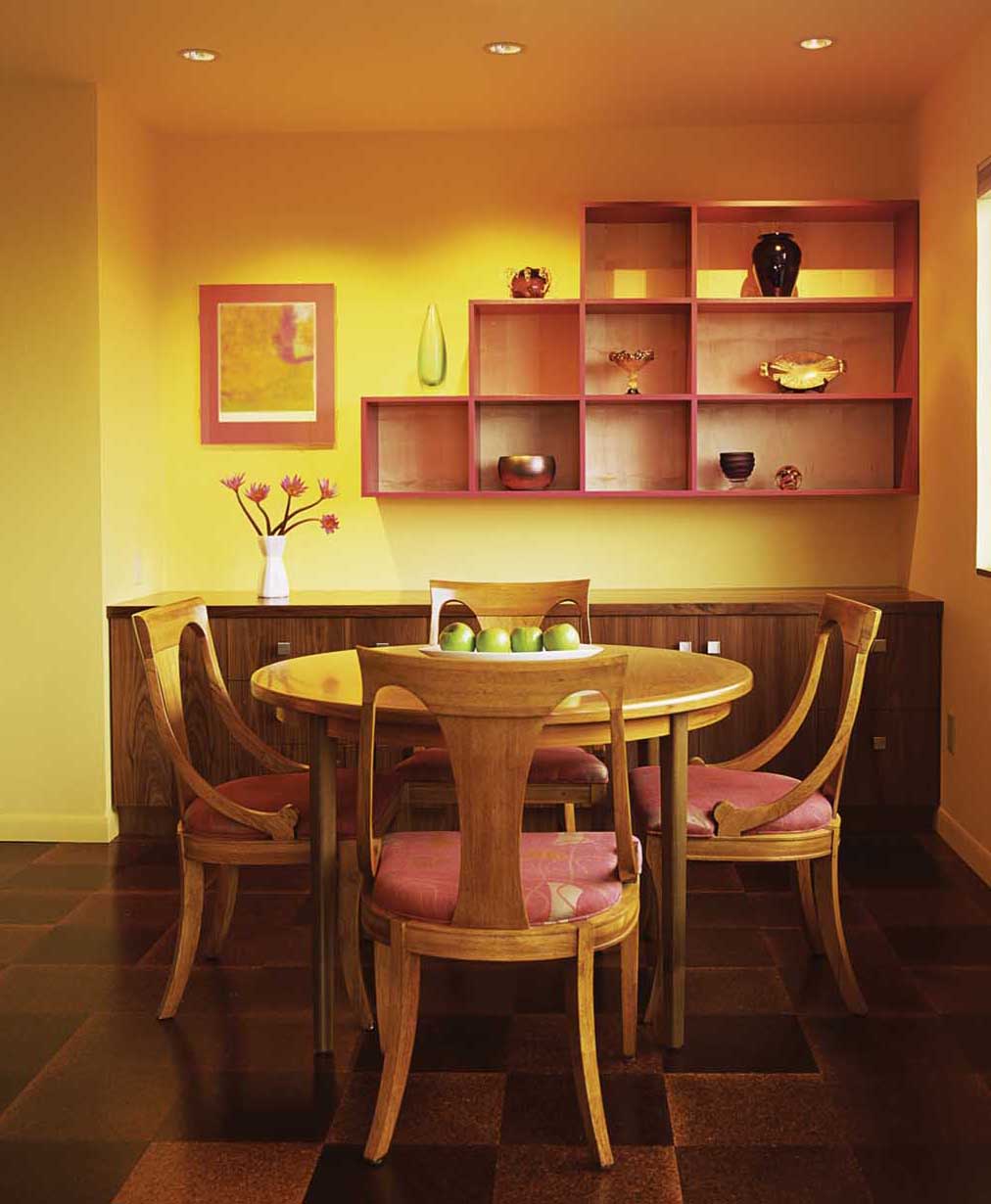 The integrity of the perception of the room depends on the rational installation of shelves. Open shelves create a smooth transition between the work area and the dining area.