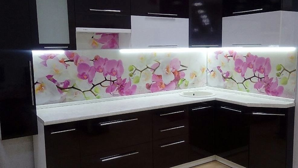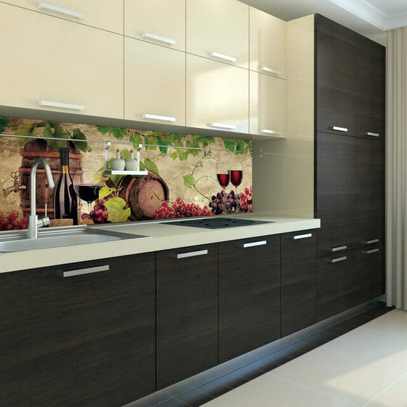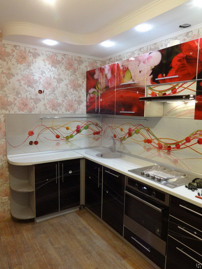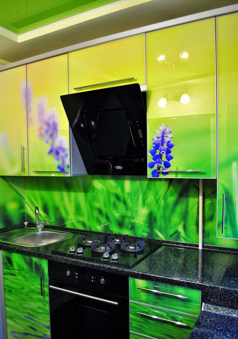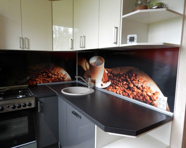 - Panels with photo printing, an interesting graphic pattern or laid out according to the principle of the gradient (color transition) - an original design approach. He successfully practices the design of a small cooking area in the studio apartment or in the living room combined with a balcony and kitchen.