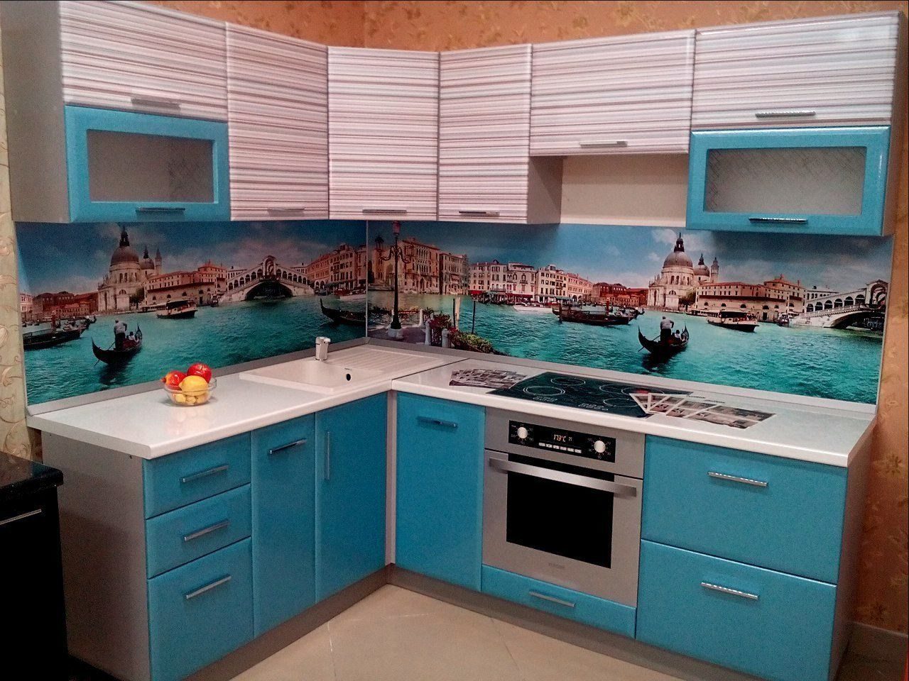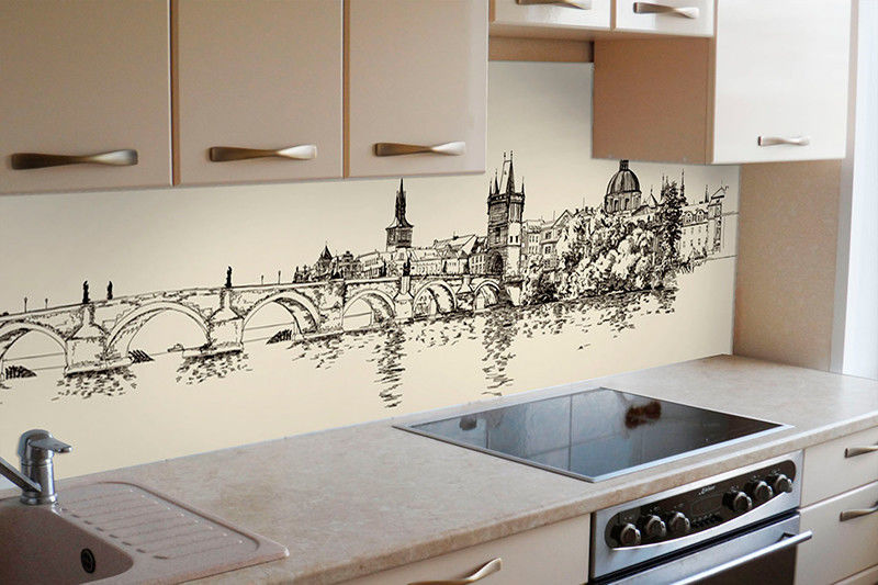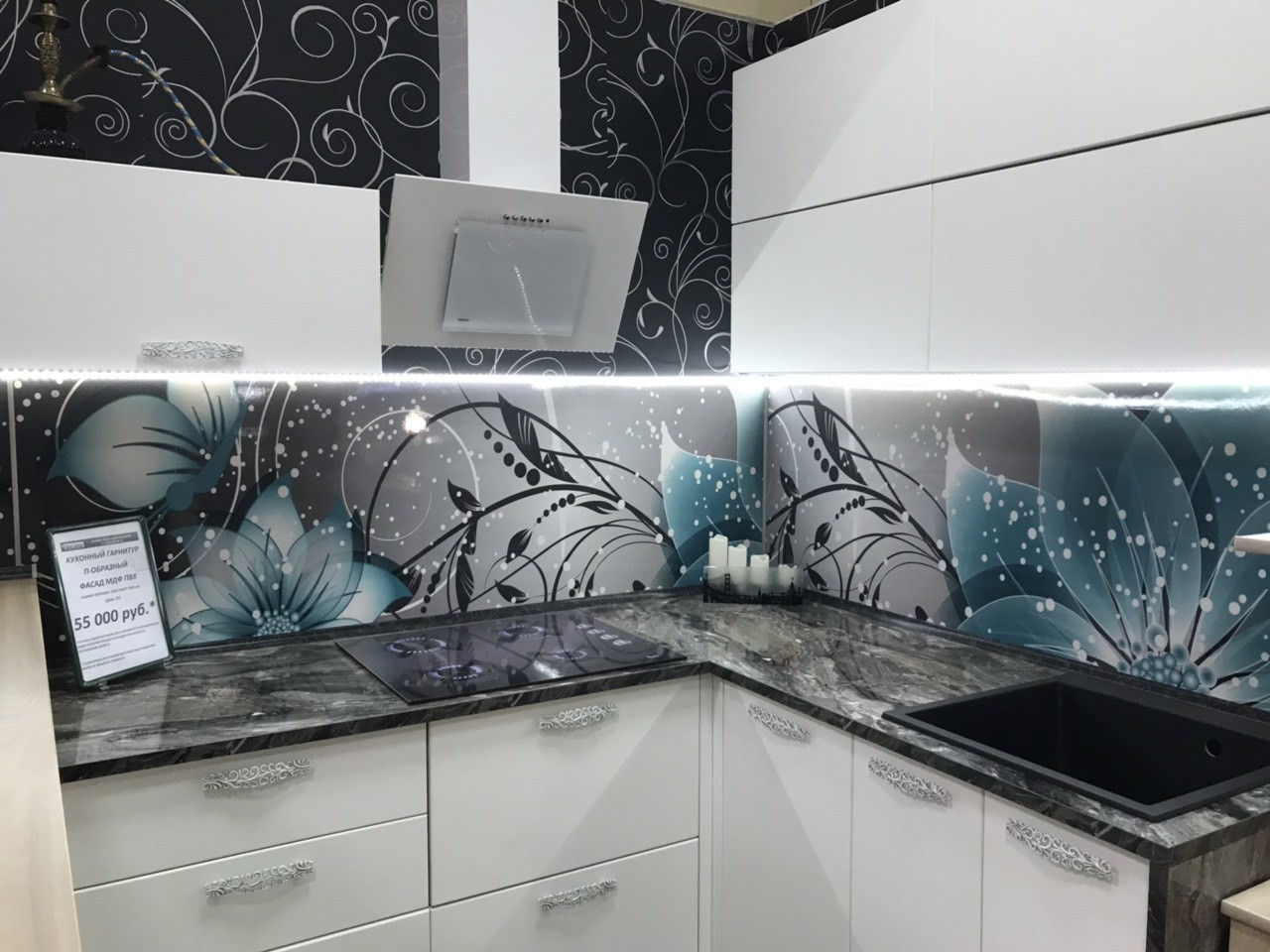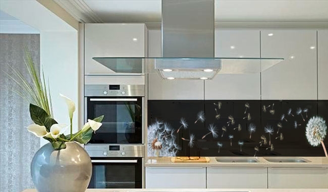- Panels with photo printing, an interesting graphic pattern or laid out according to the principle of the gradient (color transition) - an original design approach. He successfully practices the design of a small cooking area in the studio apartment or in the living room combined with a balcony and kitchen.
